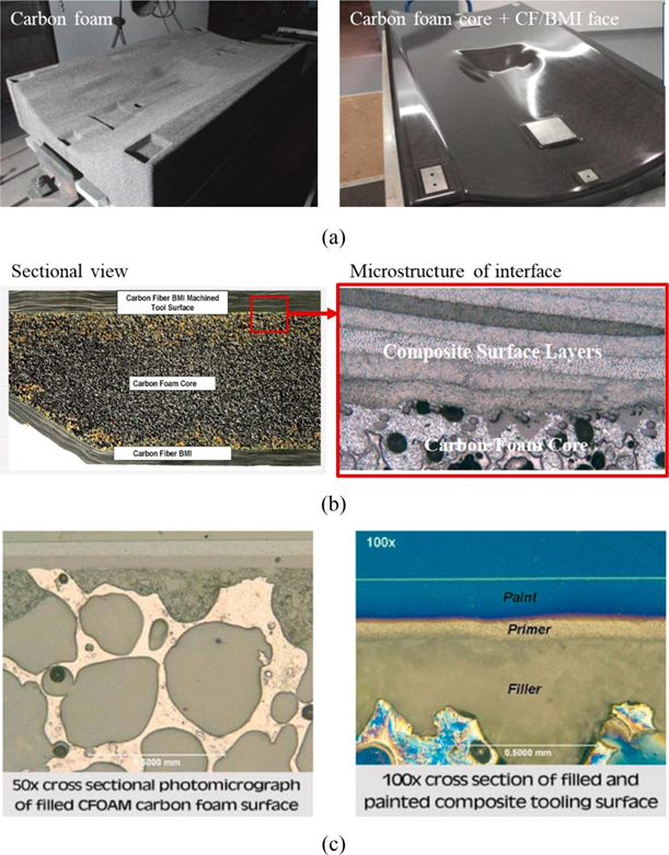 图12. (a) 带有碳泡沫的单一模具和带有碳泡沫+复合材料制造的模具比较;(b) 谈泡沫与复合材料界面的复合模具SEM显微图;(c) 填充材料与碳泡沫基材之间结合的微观结构。