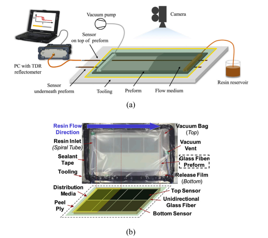 嵌入/附着工艺在复合材料或结构上用于在线监测的侵入性传感器的关键问题是它们可能对结构的性能和健康构成威胁。为了避免这个问题,应在模具中利用这些传感器来监控复合材料的制造过程,并使复合材料结构的制造具备高质量和可靠性成为一个适当的选择。耶Yenilmez等人报道了一种将电介质传一个适当的选择。Yenilmez等人报道了一种将电介质传感器网格连接到模具上的方法,以在树脂传递模塑过程中监测复合材料的填充和树脂固化进度。电子时域反射测量传感线也被整合到模具中,以实现对复合材料制造的流动和固化程度的非侵入性监测,图19(a)中可以看到传感器的附着演示。Dai等人开发了一种基于碳纳米管的织物传感器,该传感器可以安装在模具上,以实现二维流动和固化监测,如图19(b)所示。