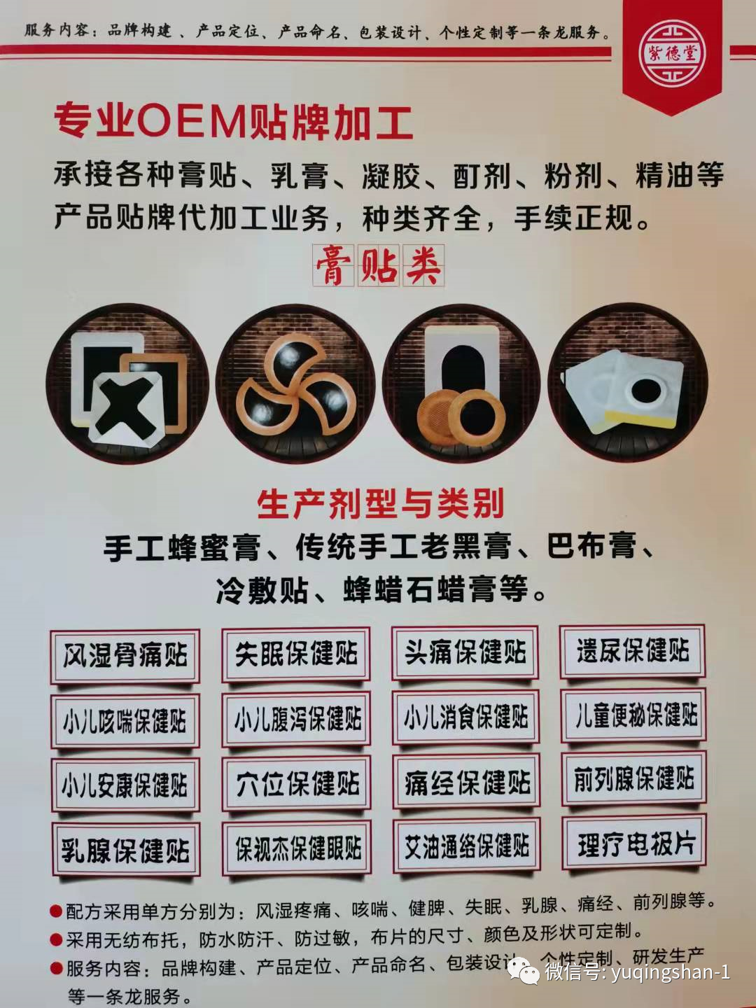 1.【贴剂贴膏】各类特色贴剂:风湿骨病贴、 骨坏死贴、 失眠贴、头痛贴、乳腺贴、痛经贴、暖宫贴、前列腺贴、眼贴、瘦身贴、多动贴、遗尿贴、腹泻贴、感冒贴、咳喘贴、厌食贴、远红外磁疗贴、通便贴等。