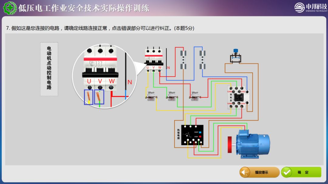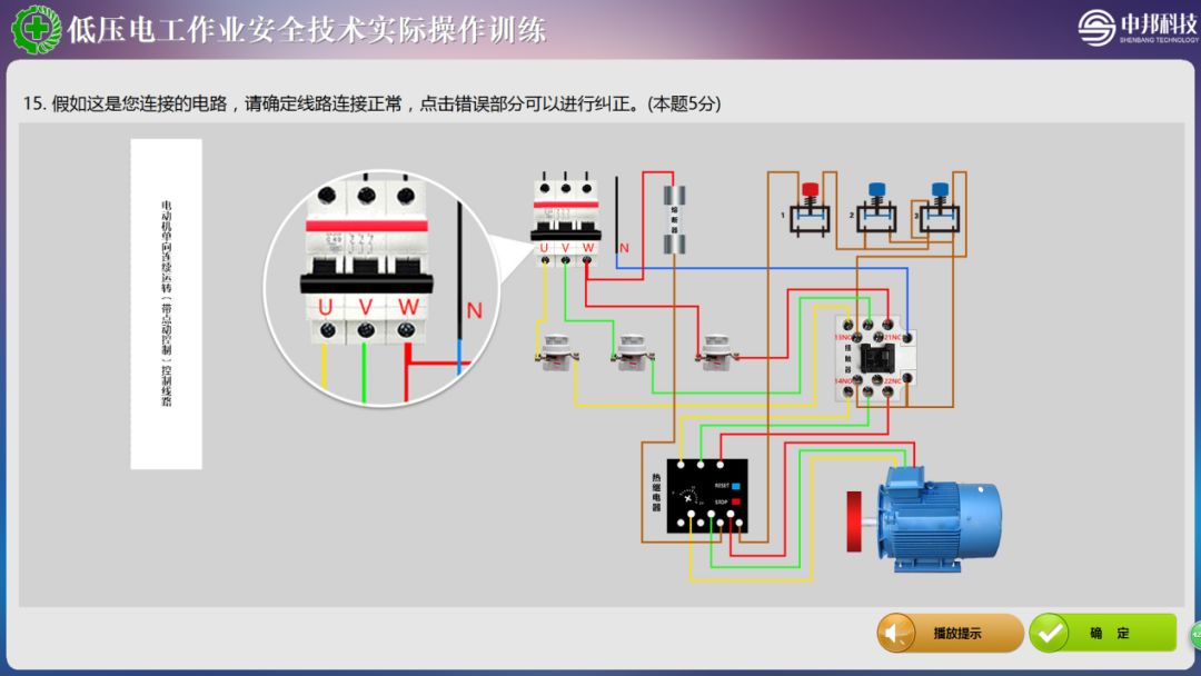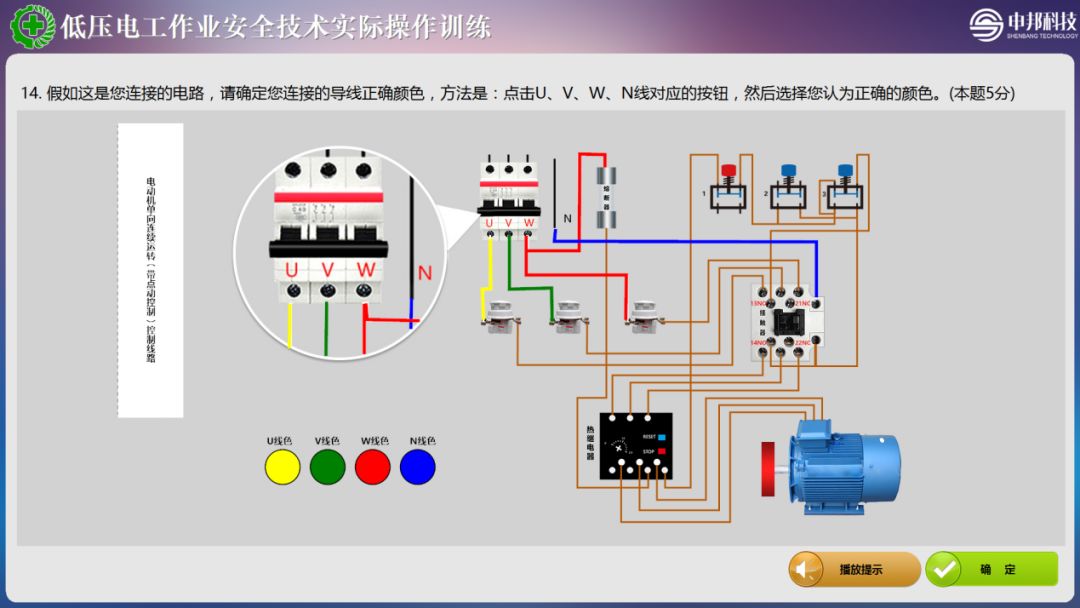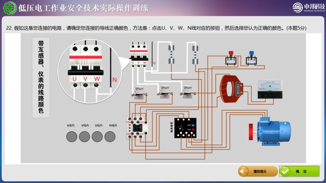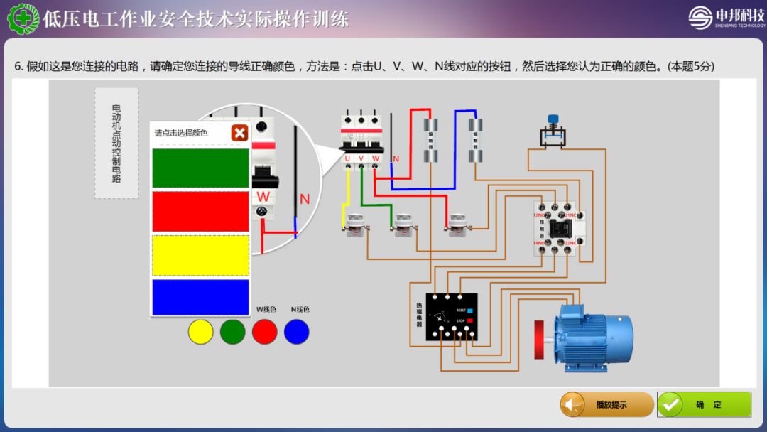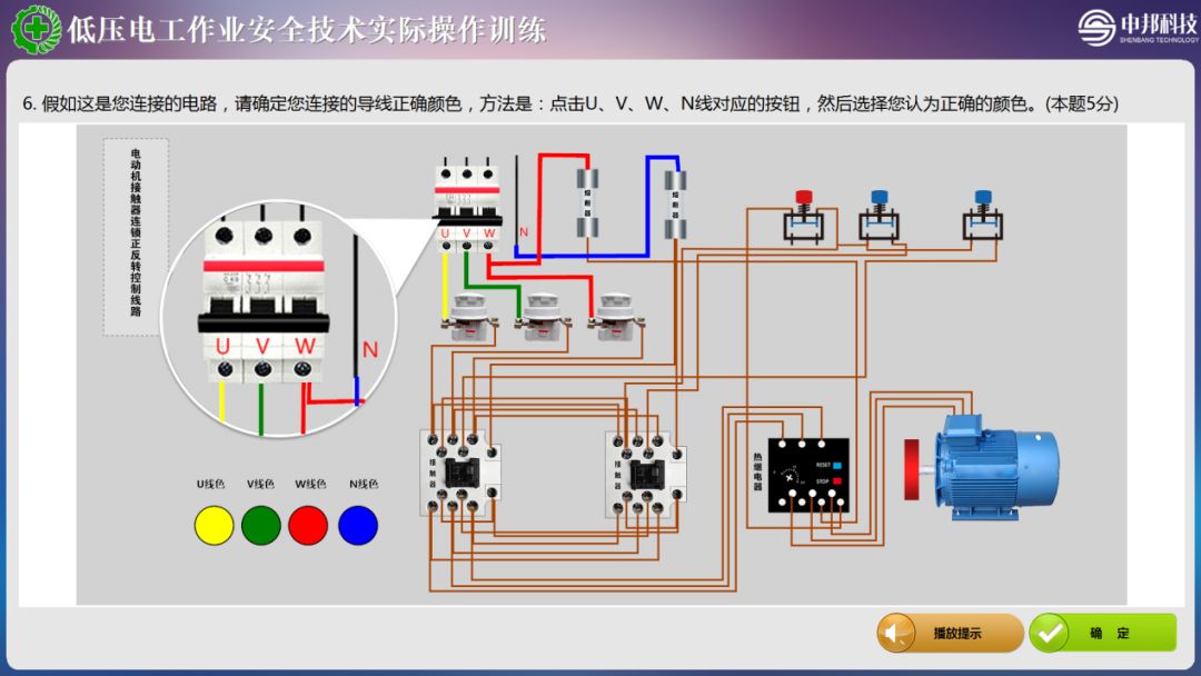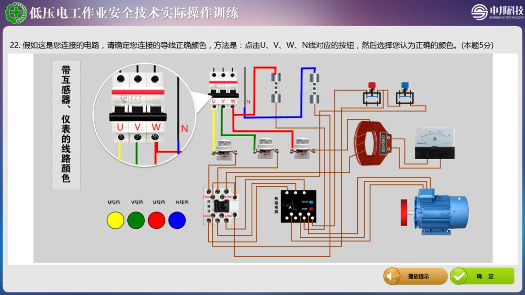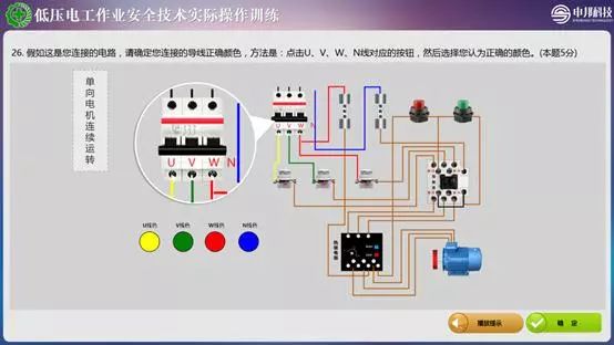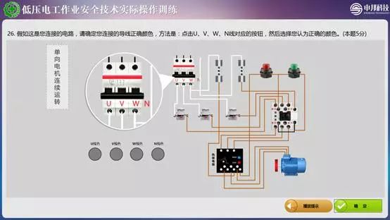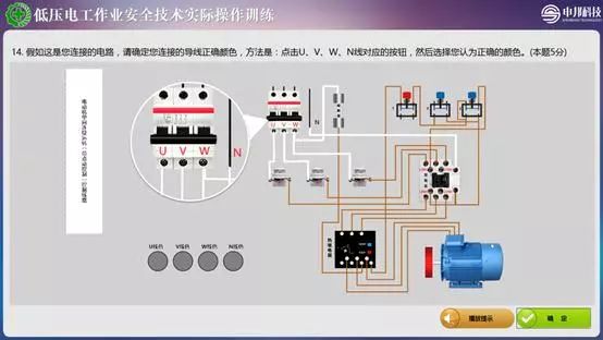 假如这是您连接的电路,请确定您连接的导线正确颜色,方法是:点击U、V、W、N线对应的按钮,然后选择您认为正确的颜色。