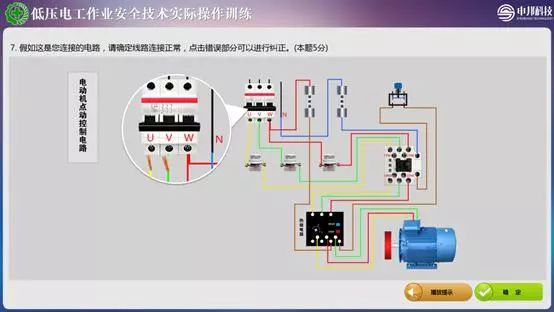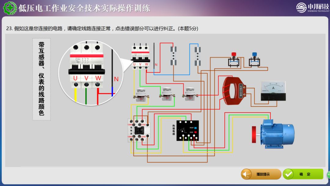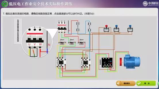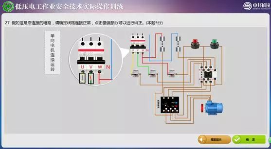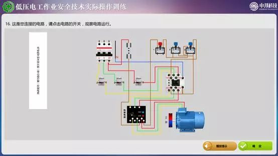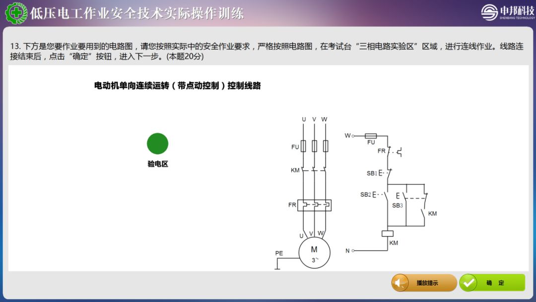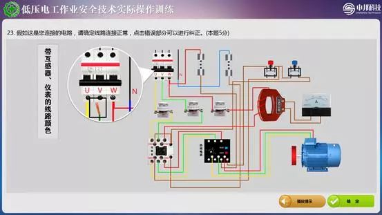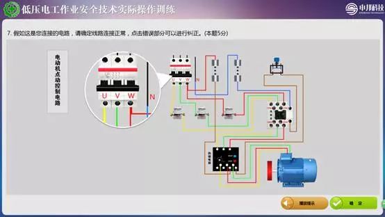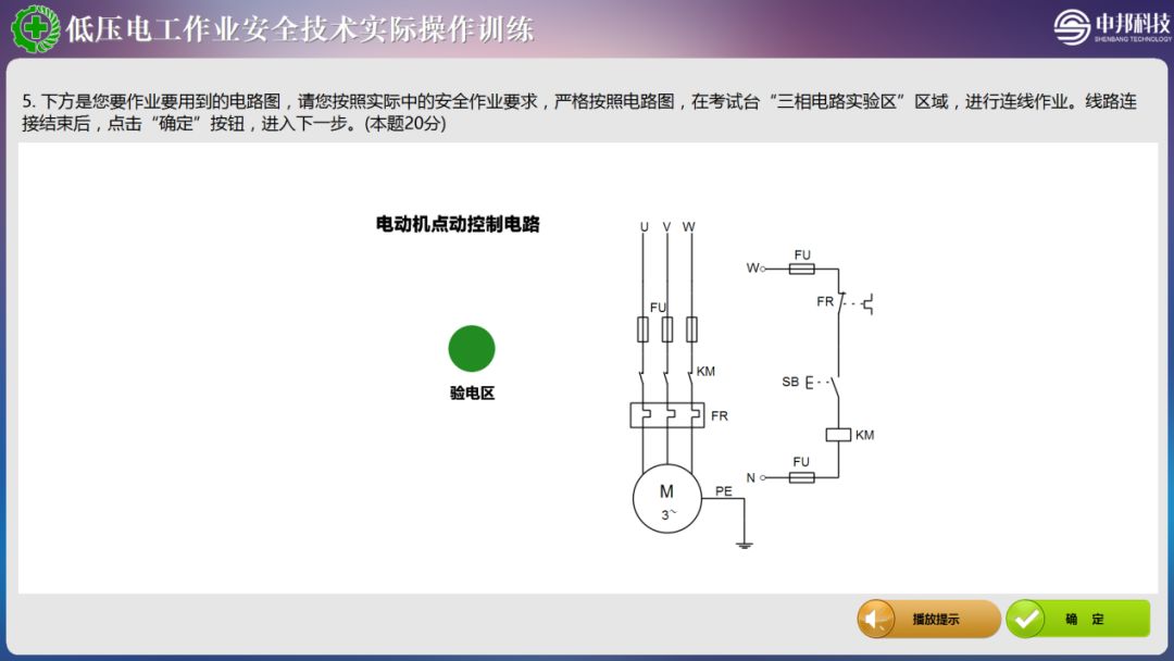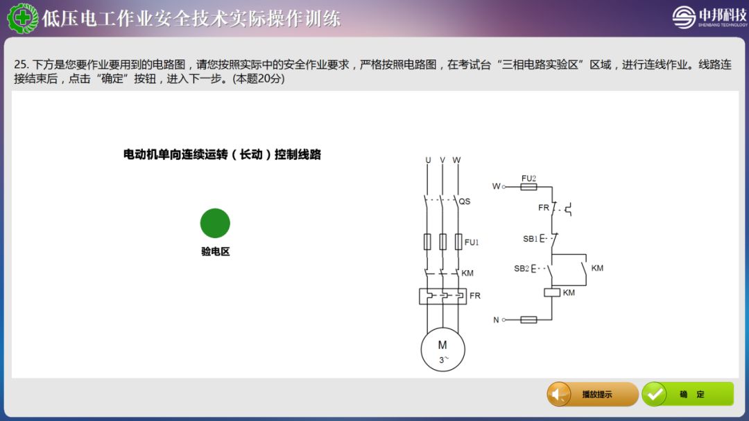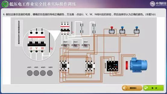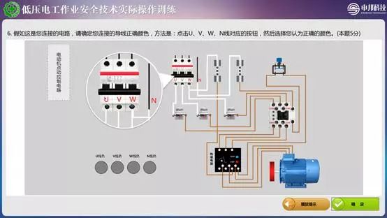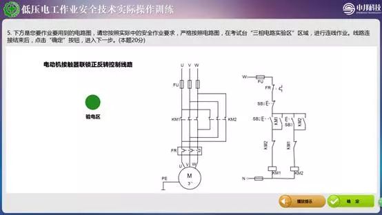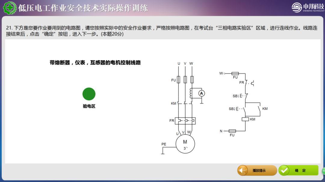 下方是您要作业要用到的电路图,请您按照实际中的安全作业要求,严格按照电路图,在考试台“三相电路实验区”区域,进行连线作业。线路连接结束后,点击“确定”按钮,进入下一步。