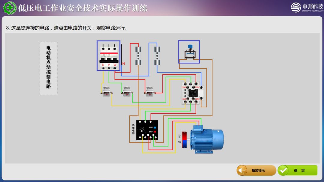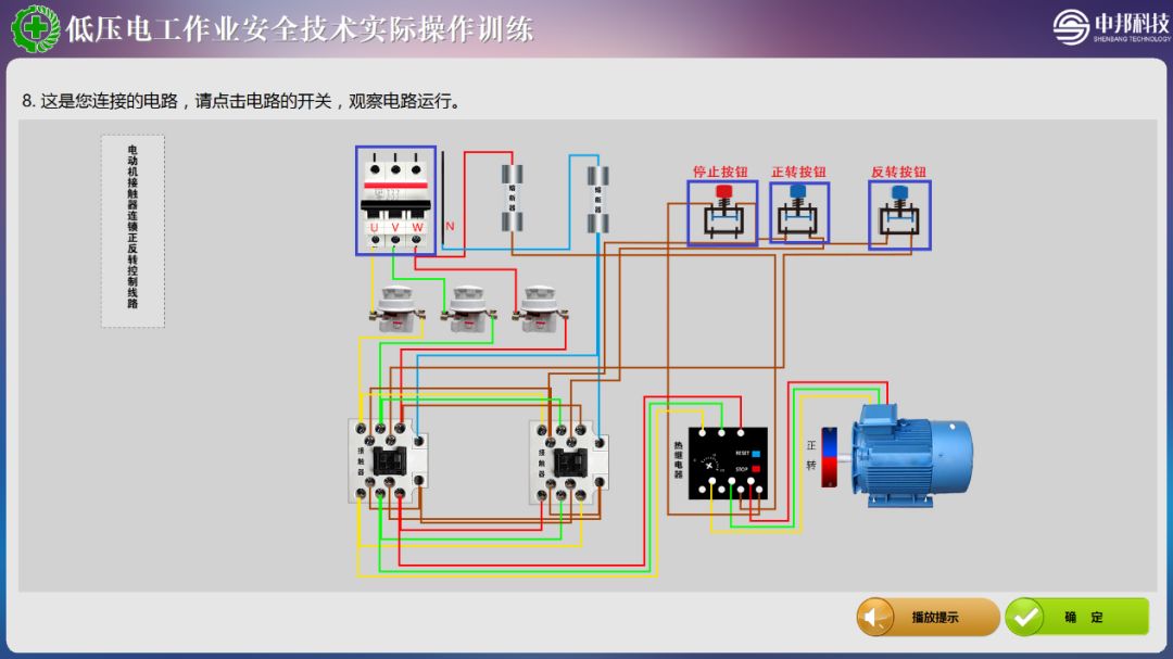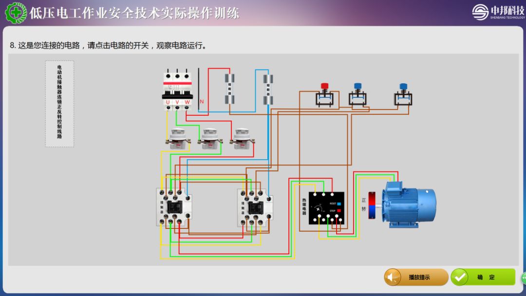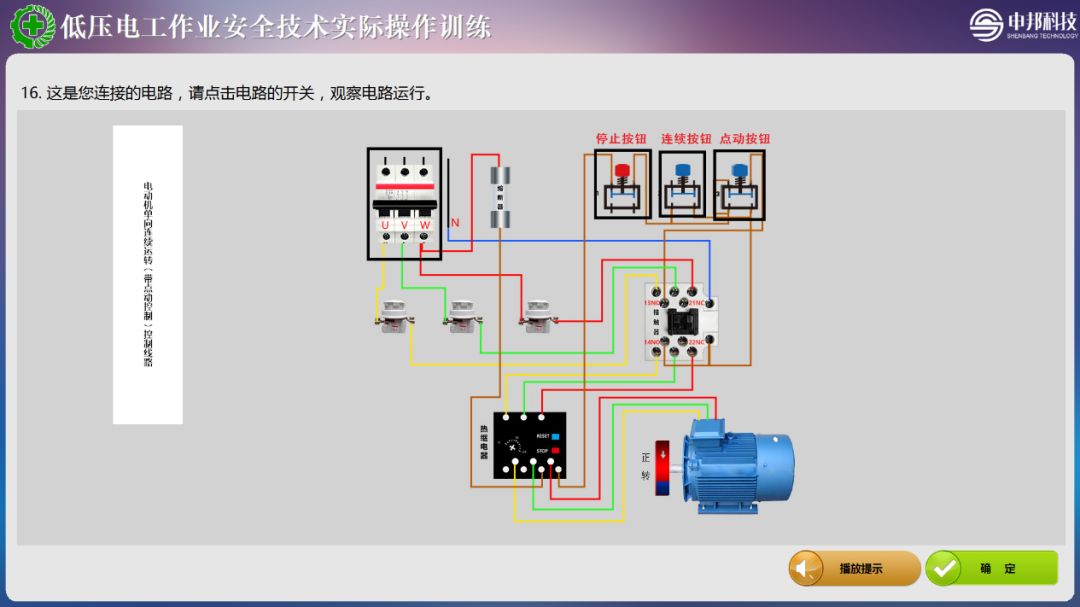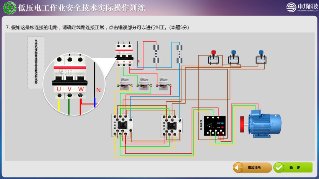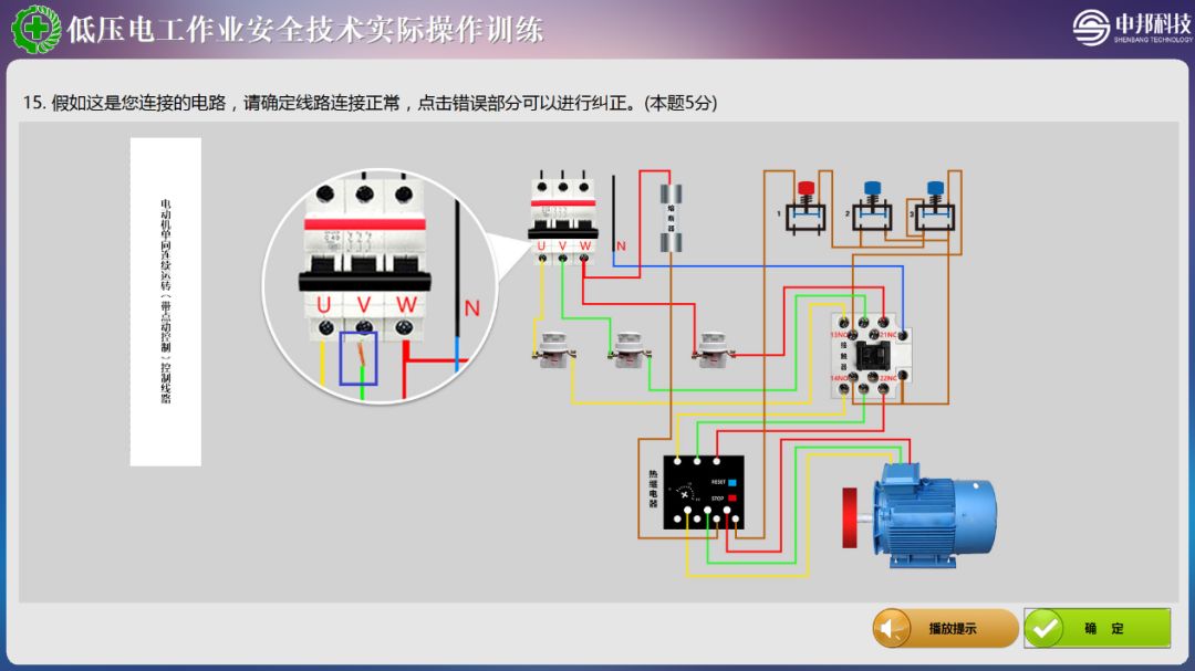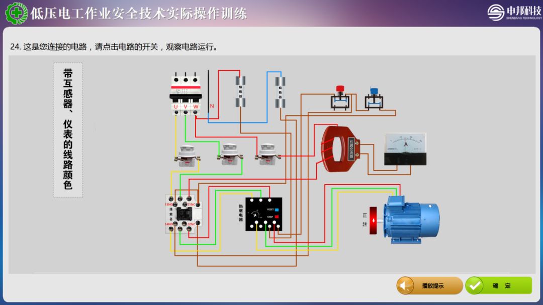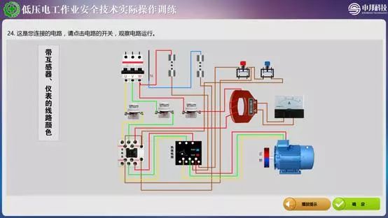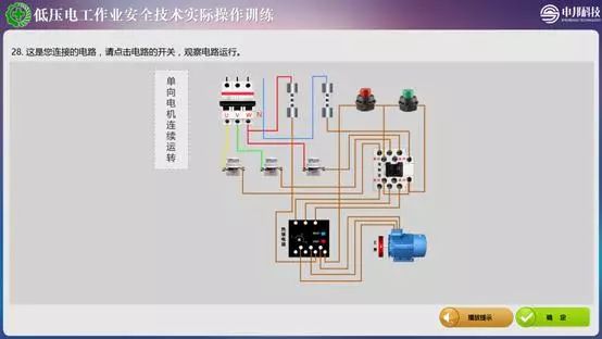 下方是您要作业要用到的电路图,请您按照实际中的安全作业要求,严格按照电路图,在考试台“三相电路实验区”区域,进行连线作业。线路连接结束后,点击“确定”按钮,进入下一步。
