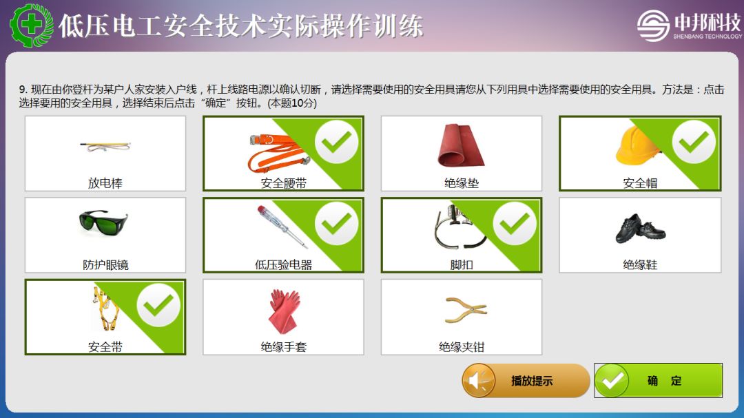 现在由你登杆为某户人家安装入户线,杆上线路不具备断电条件,请选择需要使用的安全用具请您从下列用具中选择需要使用的安全用具。方法是:点击选择要用的安全用具,选择结束后点击“确定”按钮。