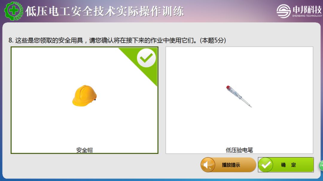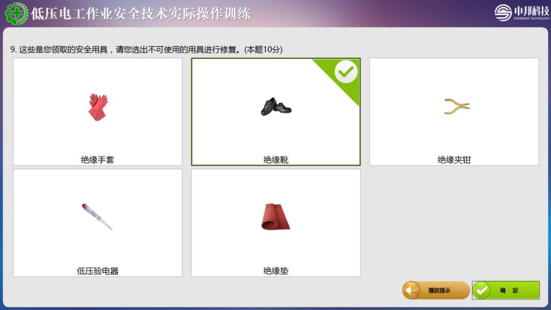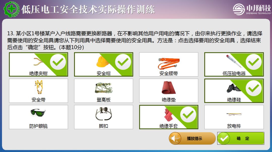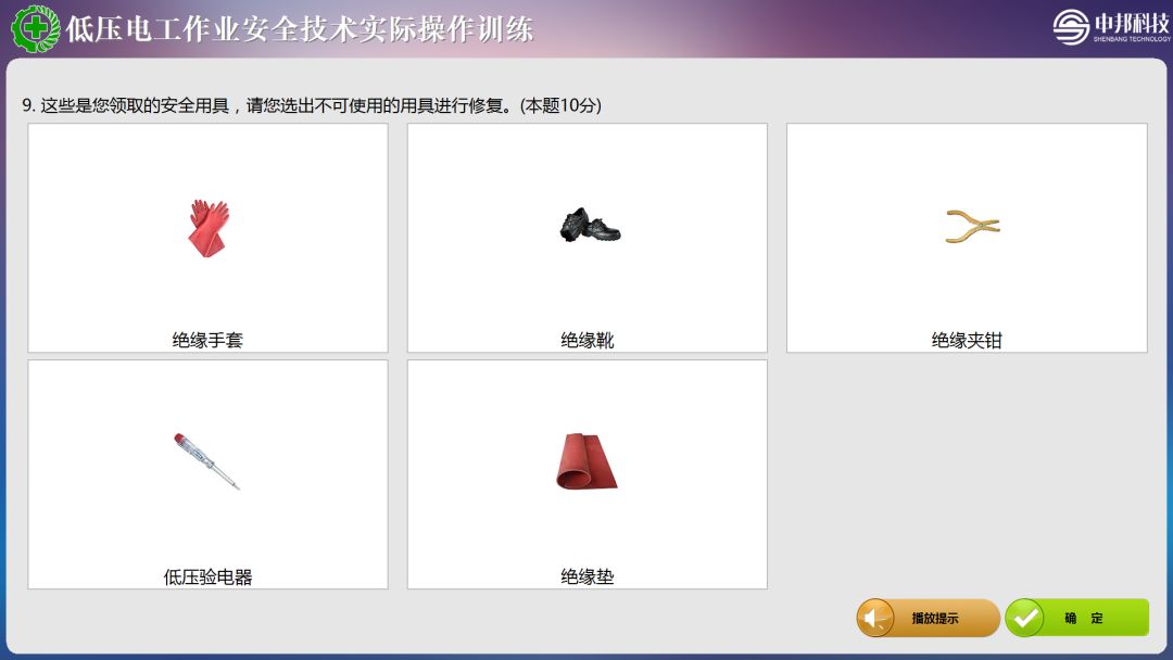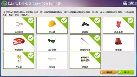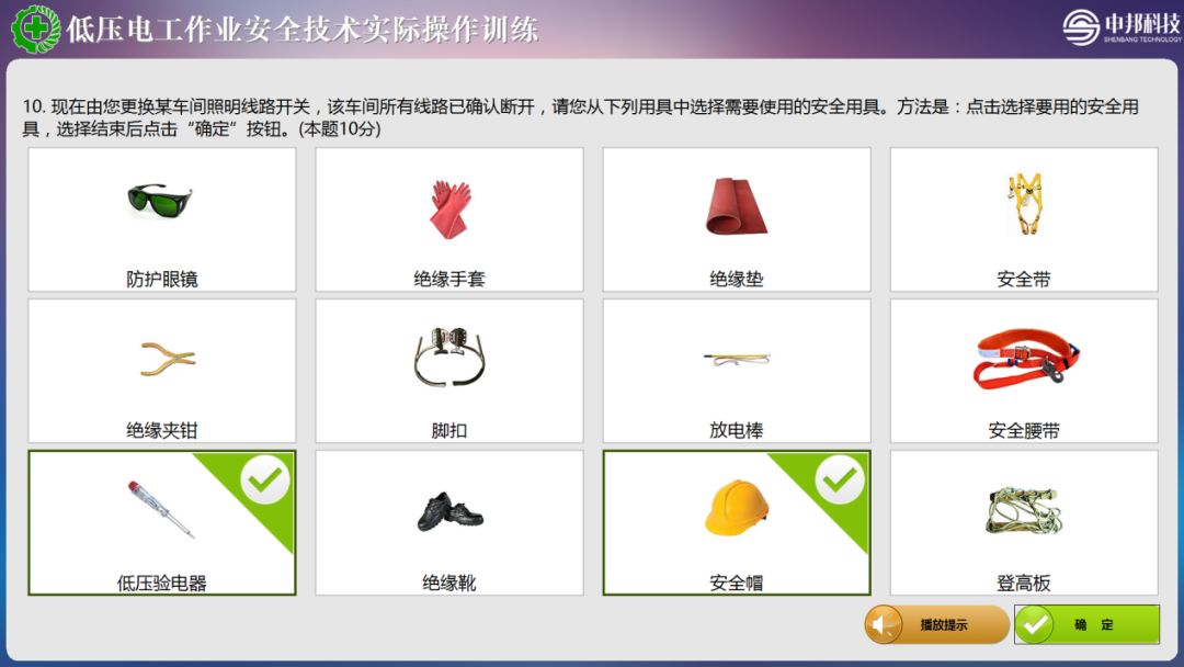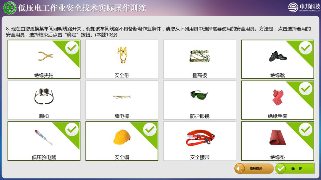 现在由您更换某车间照明线路开关,该车间所有线路已确认断开,请您从下列用具中选择需要使用的安全用具。方法是:点击选择要用的安全用具,选择结束后点击“确定”按钮。