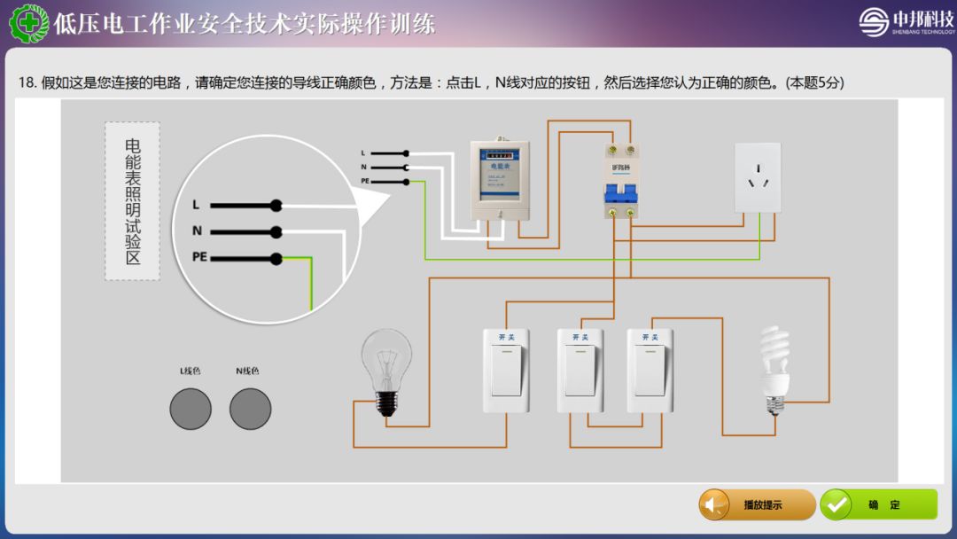假如这是您连接的电路,请确定您连接的导线正确颜色,方法是:点击L,N线对应的按钮,然后选择您认为正确的颜色。