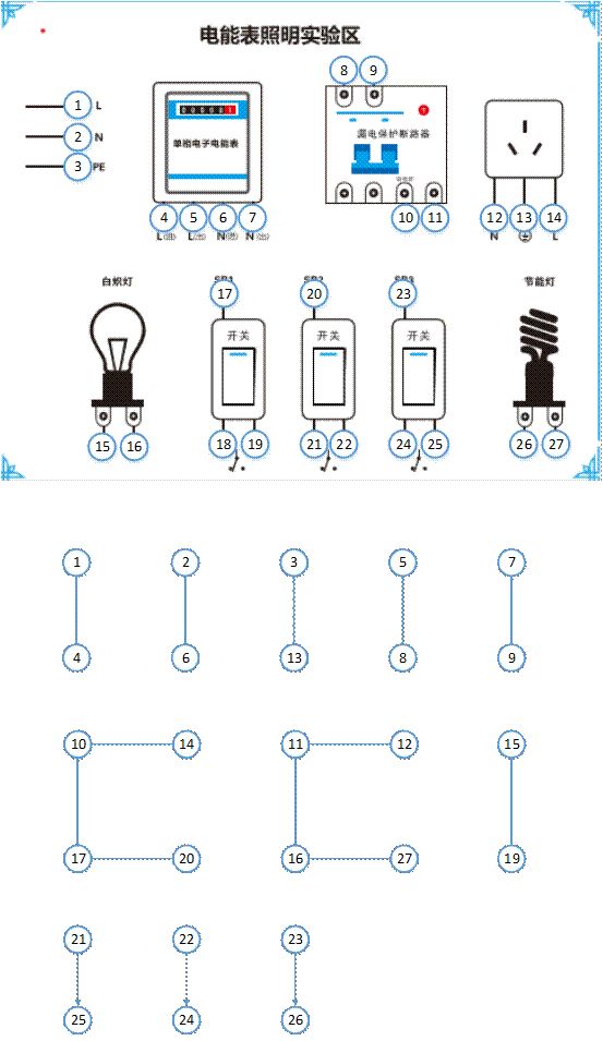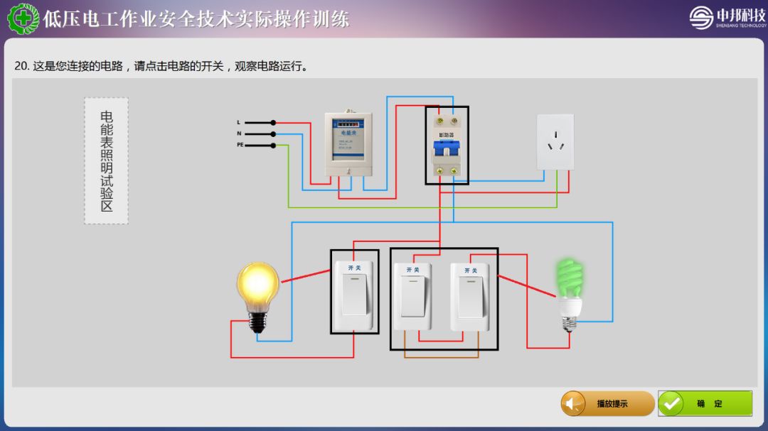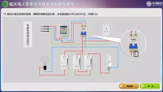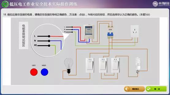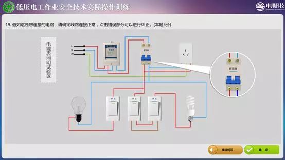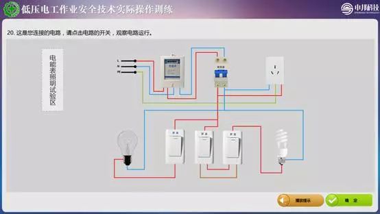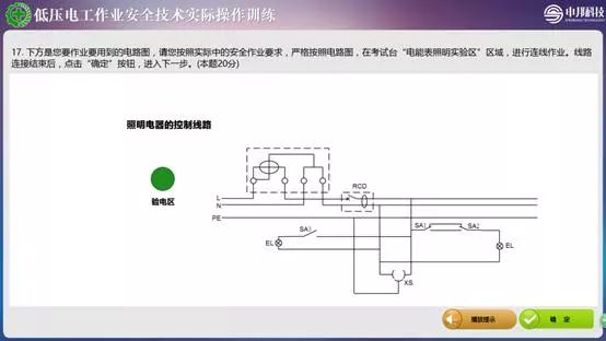 下方是您要作业要用到的电路图,请您按照实际中的安全作业要求,严格按照电路图,在考试台“电能表照明实验区”区域,进行连线作业。线路连接结束后,点击“确定”按钮,进入下一步。