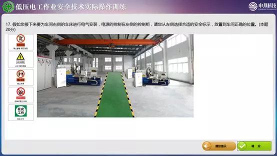 假如您接下来要为车间右侧的车床进行电气安装,电源的控制在左侧的控制柜,请您从左侧选择合适的安全标示,放置到车间正确的位置。