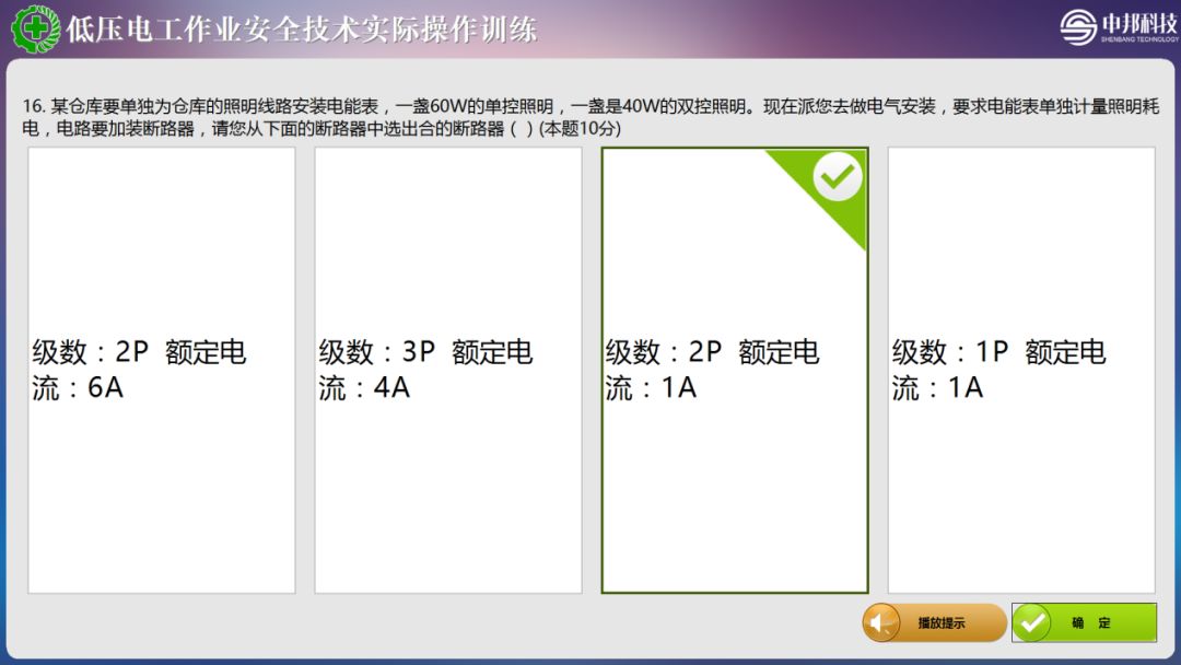 某仓库要单独为仓库的照明线路安装电能表,一盏60W的单控照明,一盏是40W的双控照明。现在派您去做电气安装,要求电能表单独计量照明耗电,电路要加装断路器,请您从下面的断路器中选出合的断路器()