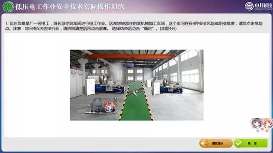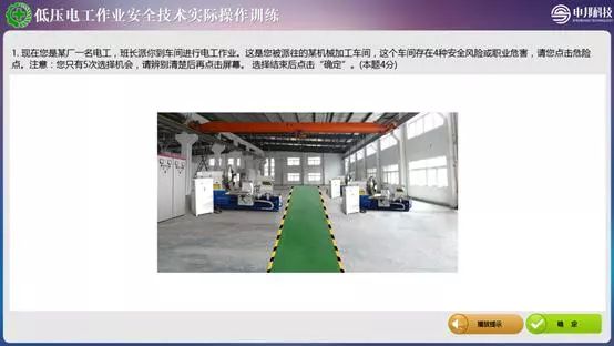 现在您是某厂一名电工,班长派你到车间进行电工作业。这是您被派往的某机械加工车间,这个车间存在4种安全风险或职业危害,请您点击危险点。注意:您只有5次选择机会,请辨别清楚后再点击屏幕。 选择结束后点击“确定”。
