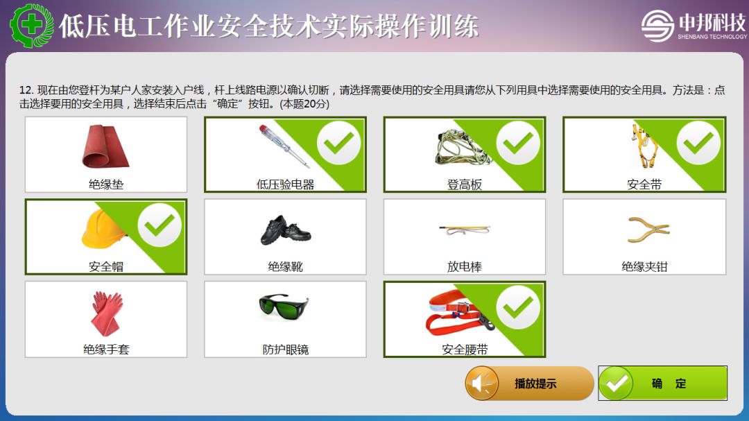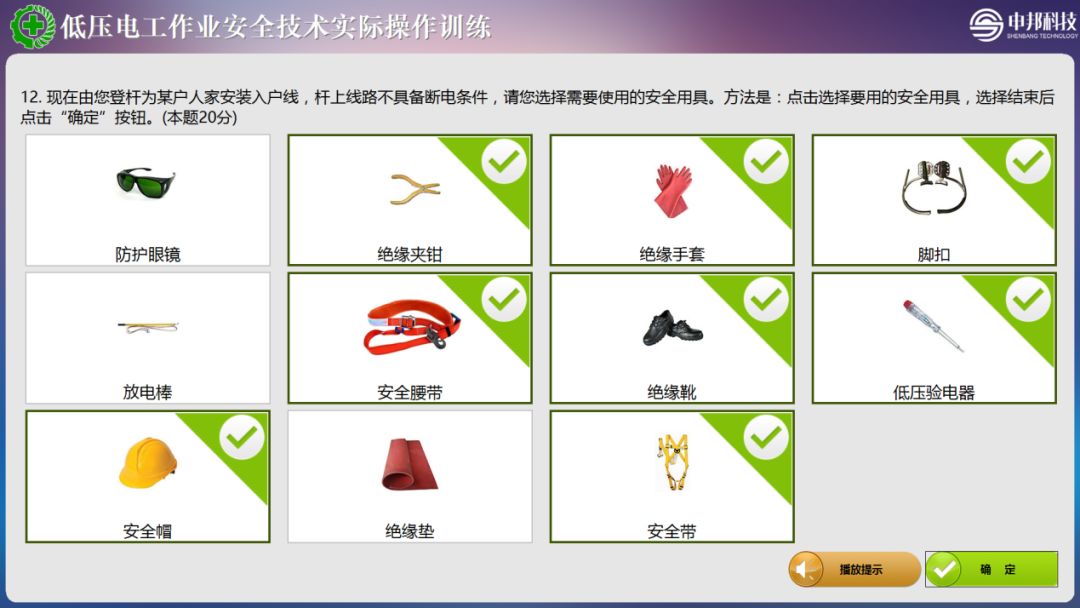 现在由你登杆为某户人家安装入户线,杆上线路电源以确认切断,请选择需要使用的安全用具请您从下列用具中选择需要使用的安全用具。方法是:点击选择要用的安全用具,选择结束后点击“确定”按钮。