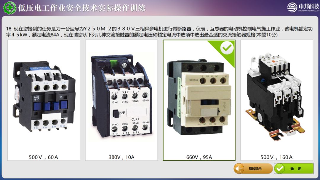 现在您接到的任务是为一台型号为Y250M-2的380V三相异步电机进行带断路器,仪表,互感器的电动机控制电气施工作业,该电机额定功率45kW,额定电流84A,现在请您从下列几种交流接触器的额定电压和额定电流中选项中选出最合适的交流接触器规格