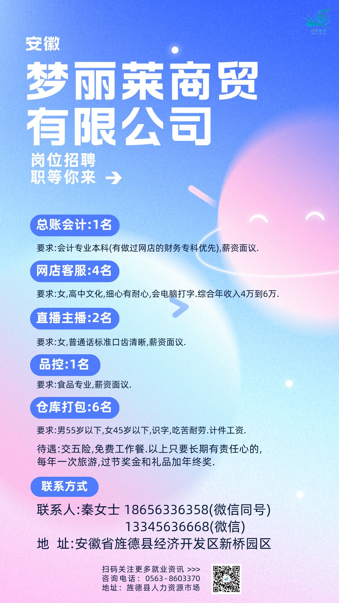 【企业招聘】安徽梦丽莱商贸有限公司招聘总账会计、网店客服、直播主播、仓库打包人员