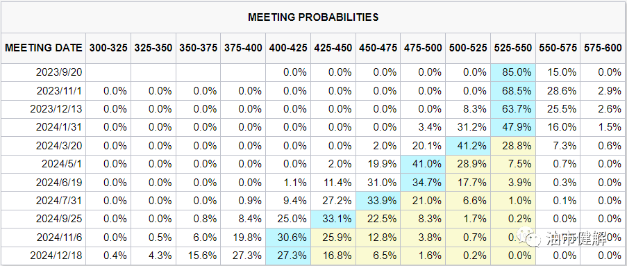 据CME“美联储观察”:美联储9月维持利率在5.25%-5.50%不变的概率为85.5%,加息25个基点至5.50%-5.75%区间的概率为14.5%;到11月维持利率不变的概率为71.7%,累计加息25个基点的概率为25.9%,累计加息50个基点的概率为2.3%。