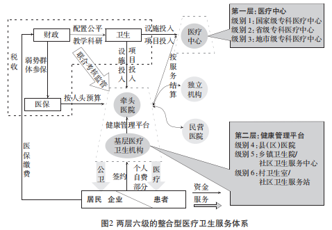 两层六级的整合型医疗卫生服务体系契合新时期卫生健康工作方针——以基层为重点、以改革创新为动力。以基层为重点在整合型医疗卫生服务体系中表现为建立有中国特色的家庭医生制度,鼓励居民主动或初次就诊时与家庭医生签约。同时,将社区卫生服务站与家庭医生、日间照料、分级诊疗等功能结合起来,推进医疗卫生服务下沉。以改革创新为动力在整合型医疗卫生服务体系中表现为创新体制机制,通过财政投入、医保支付、医疗服务价格调整、医务人员薪酬改革,建立不同层级之间利益机制,确保整合型医疗卫生服务的有效提供。