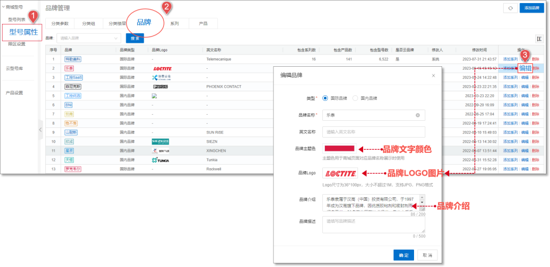 【产品-型号属性】页面:点击 品牌tab页 ,找到需要添加品牌LOGO的品牌,点击编辑,弹窗维护上传品牌LOGO即可,如下图所示: