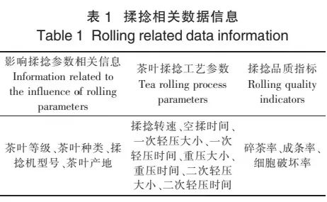 文章数据是由广西昭平仙峰茶厂提供,获取时间为2023年3~4月。在当地5位制茶师傅的指导下,采用6CR-35型茶叶揉捻机进行数据获取。获取相关数据信息如表1所示。试验获取的数据还不能直接使用,因为初始数据中包含揉捻品质指标不符合揉捻机性能指标的揉捻参数数据,会降低模型学习效率和预测精度。在数据使用前需要对数据进行预处理,此次试验预处理主要为数据清理和数据划分。
