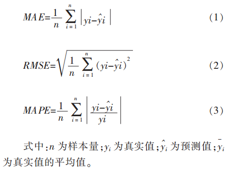 在评价模型的预测能力时,通常采用平均绝对误差(Mean Absolute Error,MAE)、均方根误差(Root Mean Squared Error,RMSE)、平均绝对百分比误差(Mean Absolute Percentage Error,MAPE)作为模型评价指标。平均绝对误差是预测值与真实值之间误差绝对值的平均值,反映了预测误差的实际情况;均方根误差是预测值与真实值之间误差平方和与样本数量比值的平方根,反映了误差分布的离散程度;平均绝对百分比误差是比较预测值与真实值之间相对误差绝对值的平均值的大小,反映了预测误差与真实值的相对大小。其表达式如式1、2、3所示,RMSE指标、MAE指标、MAPE指标得分越小,预测效果越好。