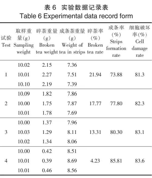 揉捻推荐系统主要功能是根据不同类型鲜叶状态来推荐其揉捻参数,为了验证推荐揉捻参数的实用性,主要选取了茶叶揉捻后的碎茶率、成条率、细胞破坏率进行测定。