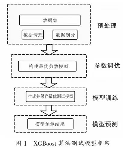 根据XGBoost的算法原理并使用Python语言,构建出XGBoost算法测试模型框架,如图1所示。一共分为四个部分,一是样本数据预处理,二是参数调优,三是模型训练,四是模型预测。