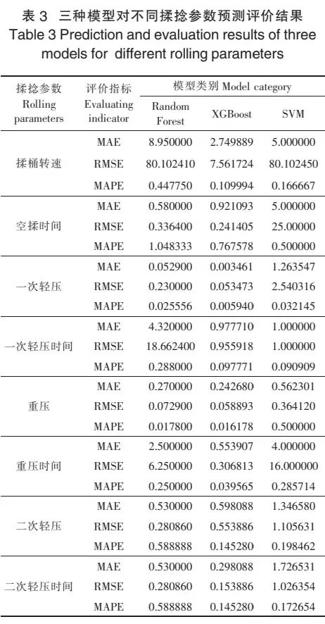 三种算法模型对揉桶转速、空揉时间、一次轻压、一次轻压时间、重压、重压时间、二次轻压、二次轻压时间预测评价结果分别如表3所示。从RMSE、MAE、MAPE三项评价指标结果来看,XGBoost模型评价指标数值最小、算法优势显著,这表明在最优参数组合的选择下,XGBoost算法模型的预测能力较好,因此系统将XGBoost算法作为茶叶揉捻推荐系统的核心,仅使用XGBoost算法模型进行下一步分析预测。