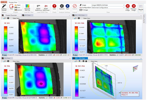 通过MatchID先进的FEVAL有限元验证评估模块可以直接将ABAQUS,ANSYS等仿真结果的位移场数据导入到实测与仿真优化分析软件中,转换为统一坐标,统一网格,统一滤波的数据并与测量结果进行比对和评估,精确的评估和修正FEA模型。