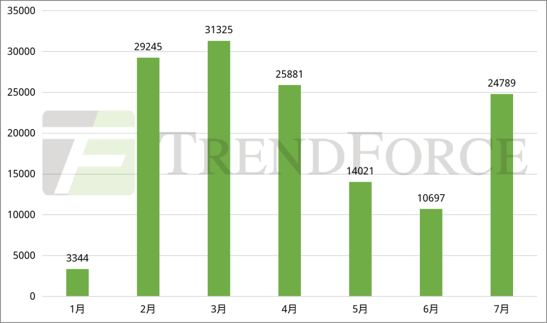 图:2023年1-7月国内组件月度招投标容量(MW)