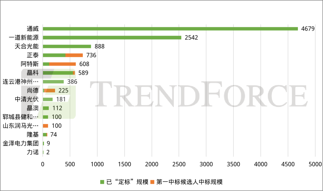 据集邦咨询不完全统计,2023年7月已公布中标结果及中标候选人的规模达11.23GW,其中,通威中标规模约4.68GW,排名第一;一道新能源中标规模约2.54GW,排名第二;天合光能中标规模约0.89GW,排名第三。TOP3企业中标规模合计约8.11GW,占中标规模的72.2%。