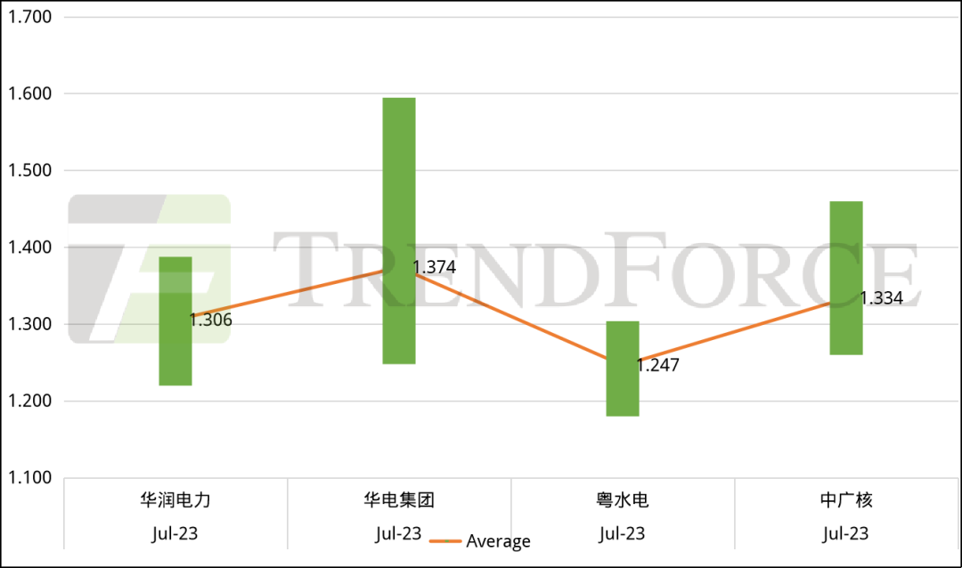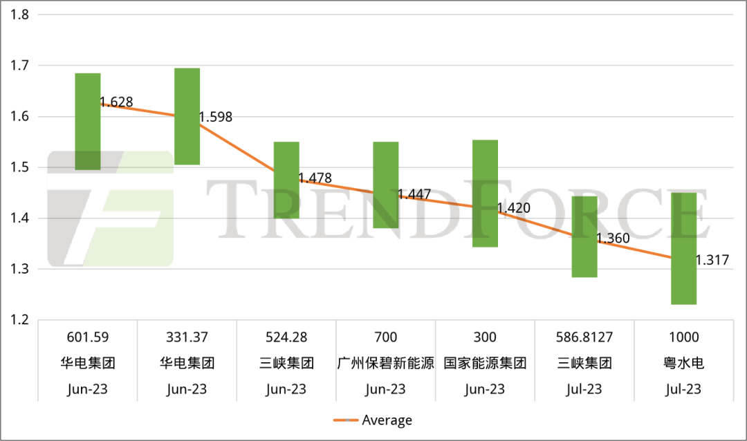 从P型组件投标价格来看,2023年7月,光伏产业链上游环节价格逐渐企稳,然终端项目尚未大规模拿货,组件企业竞争日趋激烈,投标价格较为混乱。7月华润电力、华电集团、粤水电、中广核四家企业组件集采项目开标,P型组件整体投标均价在1.247元/W-1.374元/W之间。