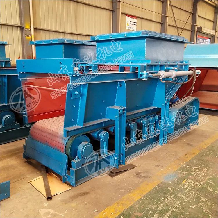 料仓内的物料经漏斗架进入箱体落在甲带上,甲带静止时物料最终靠内摩擦力而停止运动,在出料口形成一定角度的静止堆积;当驱动滚筒在外动力的驱动下开始旋转时,带动胶带运动,胶带带动其上的甲带运动,甲带带动其上的物料导向出料口,运行中的甲带在出料口卸料后转向回程,物料不断的从出料口排出,从而完成给料过程;安装在改向滚筒处的清扫器,清扫粘结在胶带上的物料,以避免物料在返程侧的撒落。改变给料量,可通过调节无级变速减速机的输出轴变速,来改变胶带运行速度的大小,从而改变给料量;改变给料量,也可通过选配变频器,改变电动机转速,从而改变给料量。甲带给料机运行中,系统主要负荷均由滚动轴承支撑,运行阻力小,设备所需驱动功率小,系统各零部件工作寿命长。