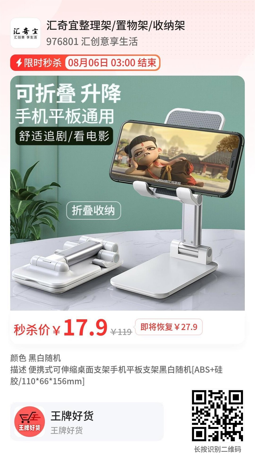 17.9?秒,可以调节高度,方便收纳,关键是底座超稳,不易倒,手机,平板都可以