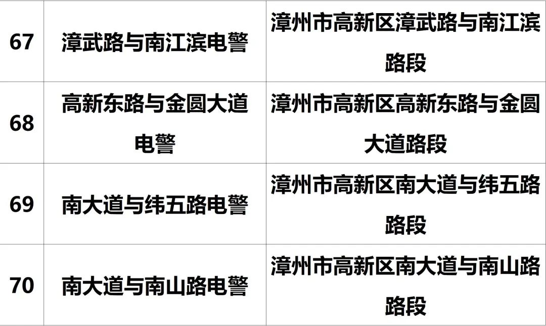 为规范我市道路交通秩序,提升城市交通管理水平与文明程度,为广大群众出行创造安全畅通的交通环境。漳州交警支队现将辖区内新增的70个交通违法采集设备安装地点、违法行为内容及违法代码公告如下,并依照《中华人民共和国道路交通安全法》有关规定对违法车辆进行抓拍处罚,望广大驾驶人员相互转告,自觉遵守交通法律法规,安全文明出行,共同维护道路交通秩序。