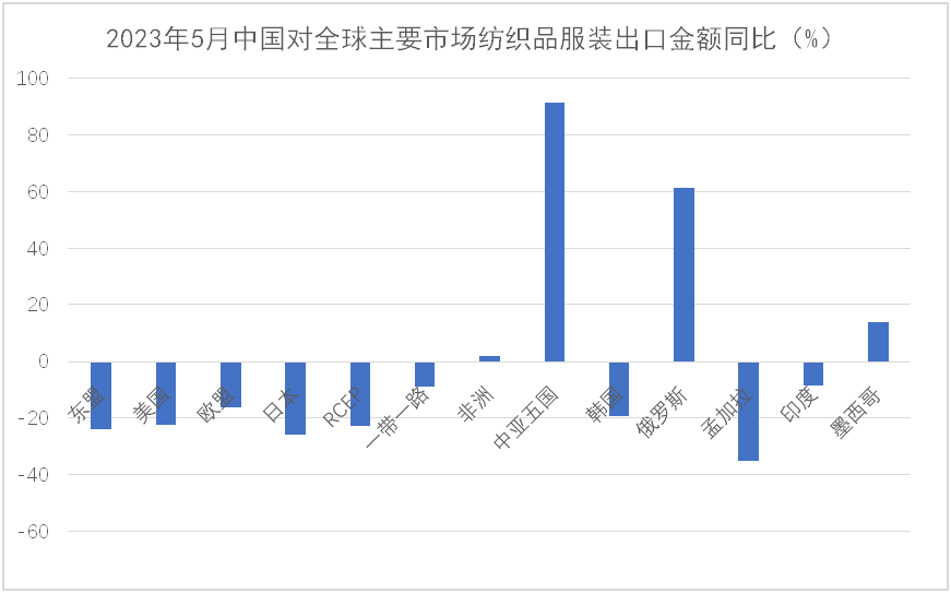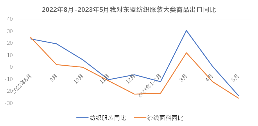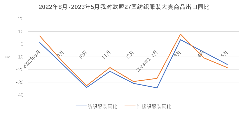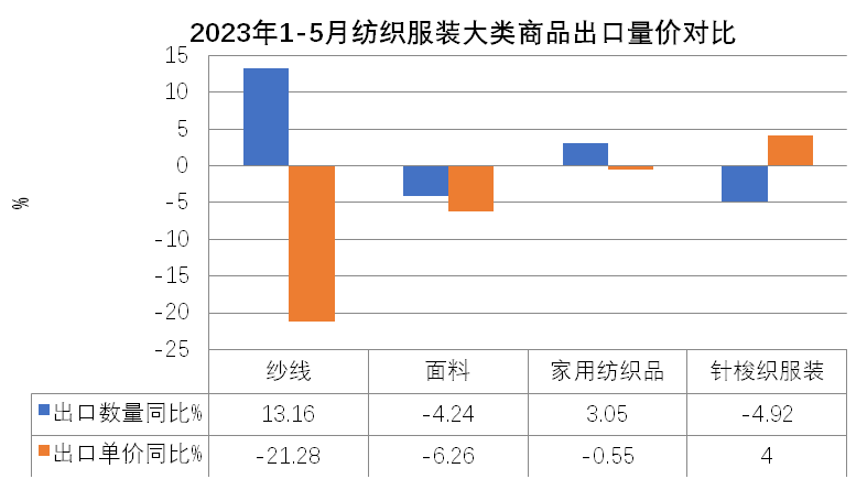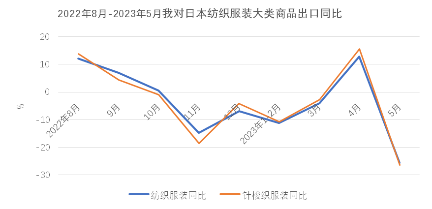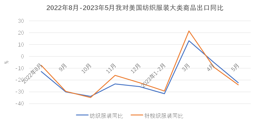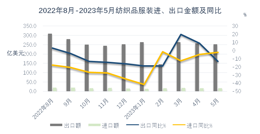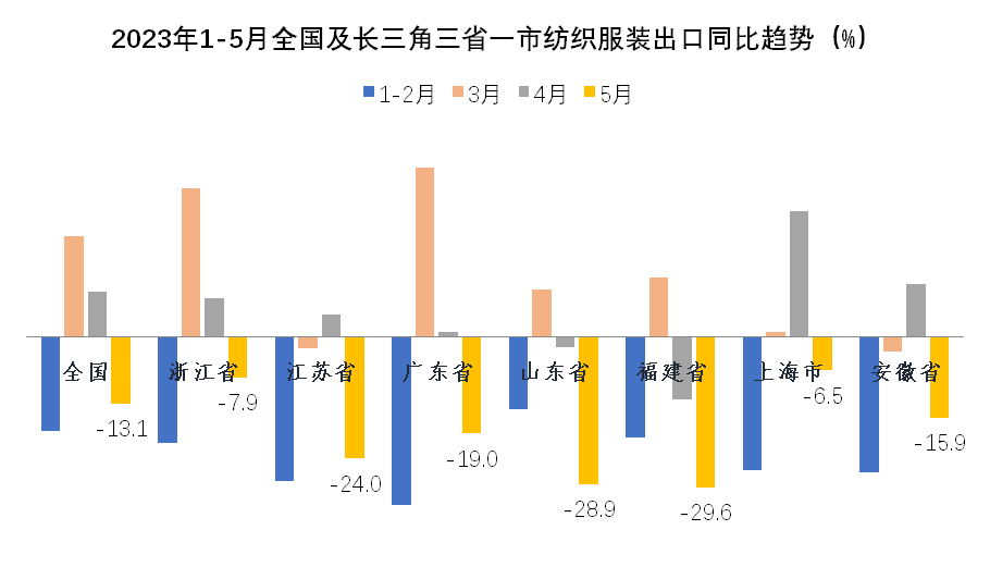 由于年初积压的订单在3月、4月基本完成出货,在国际需求收缩持续、订单下滑、去年同期高基数的压力下,5月出口同比未能延续前两个月的上涨势头,重回去年7月以来的跌势,同比下降13.1%,环比则连续第二个月下降,较上月下降1.3个百分点。6月出口走向尚不明朗,继续下滑的可能性较高。二、市场结构变化仍在继续,一带一路沿线国家和非洲等非传统市场成为出口重要推动力传统发达市场需求走弱、库存消化缓慢仍是当前我国纺织服装出口面临的主要困难。在3月、4月消化完年初积压订单后,5月我对欧美日等传统市场出口再次出现较大幅度下滑,拖累我纺织服装整体出口。5月单月,我对美国、欧盟27国和日本出口同比分别下降22.2%、15.9%和25.5%,均超13.1%的整体降幅。欧美在我出口市场中所占份额也从去年的31%降至今年前五月的27.4%,下降了3.6个百分点。同时,欧美需求不振也导致我中间品对东盟出口增长动能不足。5月,我对东盟出口同比下降23.7%。与上述四大市场形成鲜明对比的是,5月我对中亚五国、非洲国家、俄罗斯和墨西哥出口保持增长,涨幅分别达91.5%、2.1%、61.4%和14%。值得一提的是,1-5月对非洲国家累计出口105.1亿美元,同比上涨13.3%,非洲国家占我出口市场的份额提升至8.9%,1-5月我对加纳、塞内加尔、阿尔及利亚、安哥拉等国的出口增幅超过40%,在有海关统计的50多个非洲国家中,我对逾40个非洲国家出口保持了增长,非洲国家成为我纺织服装出口的重要增长点。东盟—受欧美需求下降的传导影响,我对东盟出口增长动能减弱。5月我对东盟出口同比大幅下降23.7%,环比下降13.5%。其中中间品纱线面料下降25.9%。1-5月累计对东盟出口下降3.9%,其中纱线面料合计出口下降14.1%,服装出口增长18.9%。美国—对美出口继续下跌。5月对美出口延续跌势,且跌幅有所扩大,从上月的5%扩大到本月的22.2%。重点商品针梭织服装当月出口量价齐跌,金额同比降幅由上月的9%扩大至24%,其中出口量同比下降21%,出口均价微降3.7%。1-5月我对美累计出口179.5亿美元,下降16.7%,其中针梭织服装合计出口下降16.2%,主要是出口量下降21.4%,出口均价保持6.6%的上涨。欧盟—对欧盟出口延续跌势,5月同比降幅由上月的6.2%扩大至15.9%。但在四大重点市场中,本月欧盟降幅最低。其中大类商品针梭织服装出口下降18.5%。与美国略有不同的是,对欧盟针梭织服装出口额下降更多地是由于价格下降所致,当月出口价格下跌11.1%,出口数量下降8.3%。1-5月对欧盟累计出口144.2亿美元,下降19.3%。大类商品针梭织服装合计下降20%,出口量和均价分别下跌12%和9.1%。日本—在4月实现去年11月以来唯一的月度增长之后,5月我对日出口重回跌势,当月出口同比下降25.5%,在四大重点市场中跌幅最大。其中大类商品针梭织服装出口下降26.3%,出口量同比下降23.3%,出口单价下降3.9%。1-5月,我对日本累计出口69.7亿美元,同比下降8.3%,其中针梭织服装出口下降7.4%,出口量下降3.9%,出口均价下跌3.6%。从重点市场4月的进口数据看,欧美需求回落现象突出,自主要来源地的进口额均出现较大幅度下滑。自中国进口降幅低于其自全球进口整体降幅,也低于越南、孟加拉等主要产地。4月,中国纺织服装产品在美国、欧盟、日本的市场占比分别为22.9%、24.6%和55.7%,均高于去年同期和今年3月。其中,美国4月自全球进口降至85亿美元,同比下降28.5%,自中国进口下降26.4%,自越南、印度、孟加拉、印尼、巴基斯坦和柬埔寨等主要来源地的降幅均超过30%,自墨西哥进口降幅最小,为8.1%,近岸化采购趋势明显。欧盟4月自全球进口纺织品服装90亿美元,同比下降19.3%,其中自中国进口下降18.9%,自孟加拉进口大跌31.9%,自印度、巴基斯坦和越南的进口降幅也接近或超过20%,自土耳其进口下降16.6%。4月,日本自全球进口纺织品服装26亿美元,增长4.8%,其中自中国进口增长12.5%,自越南、缅甸进口实现2-3%的小幅增长,自孟加拉进口则下降16%。5月,纺织品和服装出口分别下降14.2%和12.2%。四大类商品纱线、面料、家用纺织品和针梭织服装出口额均下滑,下降幅度分别为16%、14.4%、5.2%和12.4%。从出口数量看,纱线和家用纺织品出口量继续保持增长,增幅分别为4.4%和5.4%,面料和针梭织服装出口量下滑,降幅分别为6.6%和6.9%。从出口价格看,当月四大类商品价格全部下跌,针梭织服装和面料下跌略缓,纱线和家纺下跌最快,降幅均超10%。1-5月,纺织品累计出口额下降9.4%,服装出口额下降1.1%。四大类商品中,除家用纺织品出口额上涨2.5%外,其余三类产品出口额均下降,纱线和面料出口额分别下降10.7%和10.6%,针梭织服装出口额微降1.1%。其中,纱线出口额下降主要是由价格下降所致,1-5月纱线出口单价大幅下降21.3%,出口数量则同比提高13.2%;面料出口量价齐跌;针梭织服装出口则量跌价升。5月,在外需不振和去年5月基数高因素叠加影响下,主要省市纺织服装出口下跌超预期,排名前六的浙江、江苏、广东、山东、福建和上海分别下降7.9%、23.9%、18.9%、28.9%、29.5%和6.5%。此外,新疆、广西和湖北同比增长139.9%、127.7%和44.4%,侧面反映出后疫情时期由于订单减少、用工成本增加,传统外贸省份产业链向中西部地区转移的趋势。1-5月,全国31个省(市、区,不含港、澳、台)中有12个省保持增长,其中新疆(96.3%)、广西(155.1%)、四川(52.9%)、贵州(164.4%)增幅较大。排名前六的重点地区浙江、江苏、广东、山东、福建和