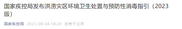 近日,国家疾控局发布《洪涝灾区环境卫生处置与预防性消毒指引(2023版)》,包括生活饮用水、个人住宅等环境的清理与消毒,灾后村落和场所环境卫生处置、灾后个人健康教育与防护等方面。