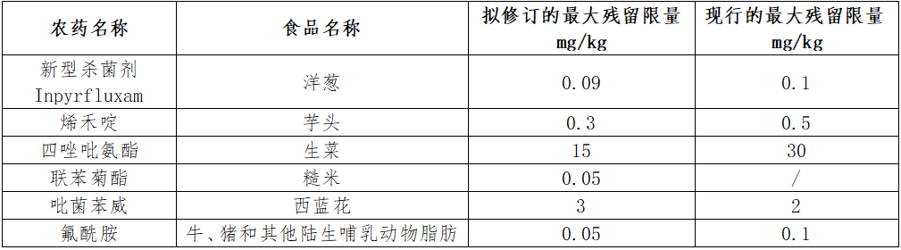 2023年7月26日,日本厚生劳动省发布495230101号提案,报修订食品和食品添加剂规格标准。具体内容包括:1.修制订部分食品中新型杀菌剂(Inpyfluxam)等多种农兽药的最大残留限量,具体见下表;2.规定食品添加剂 L-半胱氨酸盐不得用于面包及天然果汁以外的食品但作为调味物质时不受该适用范围限制;3.规定豁免氧化锌在食品中最大残留限量。