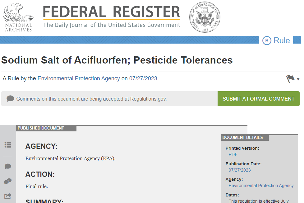 https://www.federalregister.gov/documents/2023/07/27/2023-15900/sodium-salt-of-acifluorfen-pesticide-tolerances