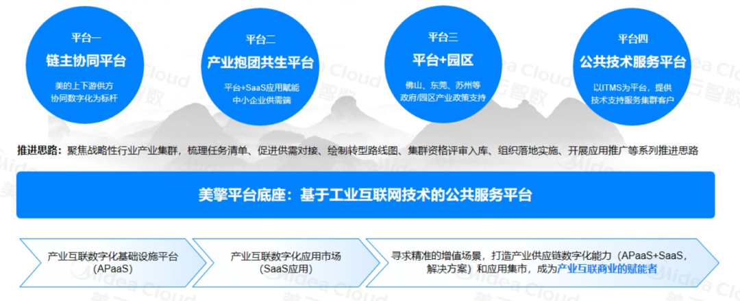 美云智数提供基础技术平台底座,协同链主及行业生态基于平台开发数字化系统和整合各领域资源,拉通行业产业链企业研-产-供-销全价值链,优化集群内产业链结构与空间布局,构建工业互联网平台生态,推动产业链企业加快向价值链中高端攀升。美云智数已在佛山打造四个最具价值的增值场景“链主协同平台、产业共生平台、平台+园区服务平台、公共技术服务平台”,通过四大场景将聚合行业领头企业和中小企业形成生态,沉淀工业技术知识,赋能工业制造全价值链。