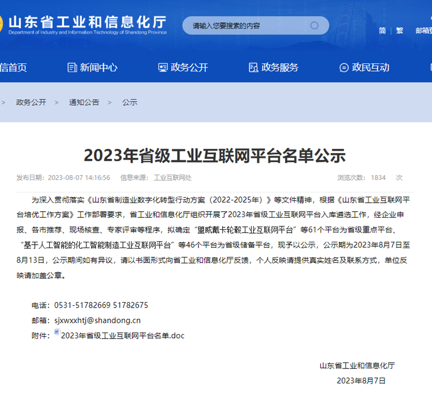 8月7日,山东省工业和信息化厅公示了2023年省级工业互联网平台名单。经企业申报、各市推荐、现场核查、专家评审等程序,拟确定61个省级重点平台、46个省级储备平台。公示期为2023年8月7—13日。