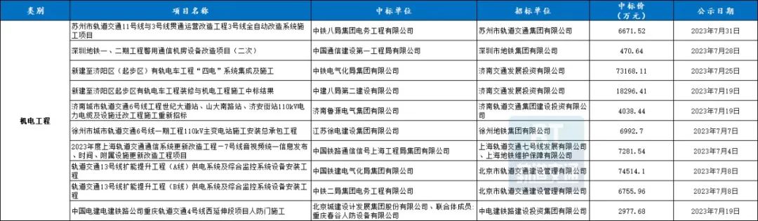 7月城市轨道交通机电工程共10条中标信息,中标总额超201167.1万元。