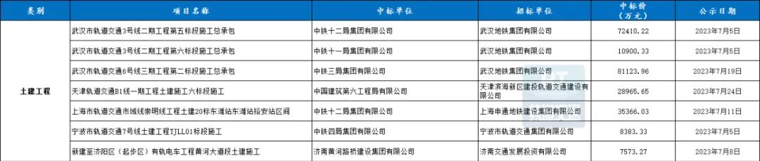 7月城市轨道交通土建工程共7条中标信息,中标总额超244722.79万元。