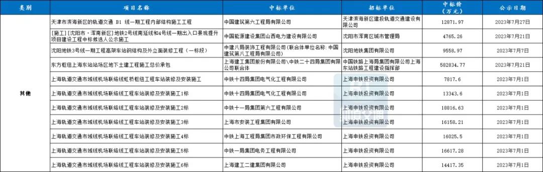 7月城市轨道交通其他共11条中标信息,中标总额超713227.14万元。
