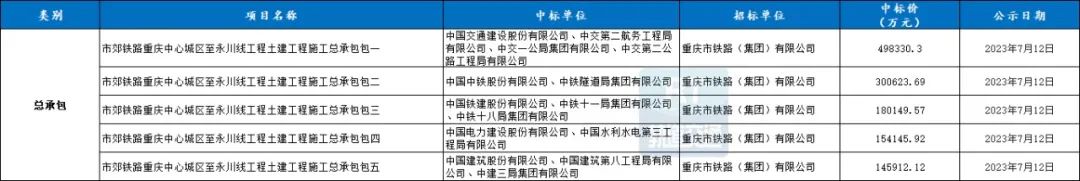 RT轨道交通数据统计,2023年7月城市轨道交通工程市场,分为土建工程、机电工程、工程监理、其他工程等大类,共52条中标项目,中标总额超过2662196.48万元。7月城市轨道交通总承包工程共5条中标信息,中标总额超1279161.6万元。市郊铁路重庆中心城区至永川线工程5个标段分别由中国交建、中国中铁、中国铁建、中国电建、中国建筑五大央企联合体获得。