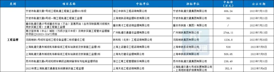 7月城市轨道交通工程监理共9条中标信息,中标总额超6599.09万元。
