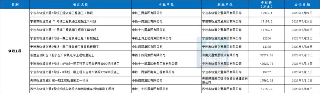 7月城市轨道交通轨道工程共10条中标信息,中标总额超217318.76万元。