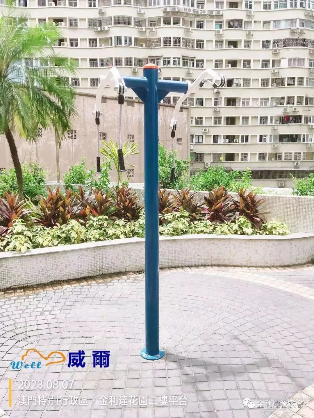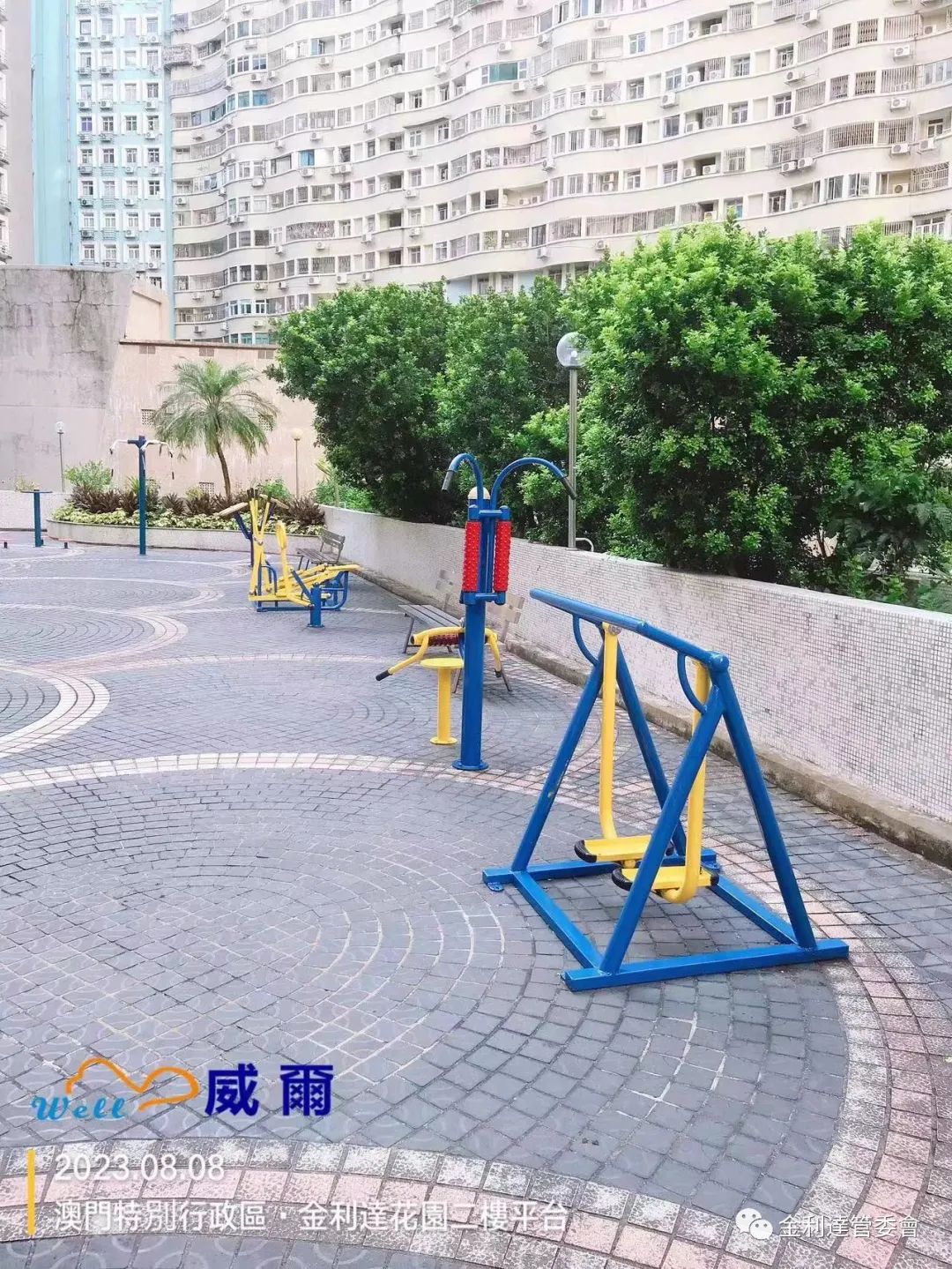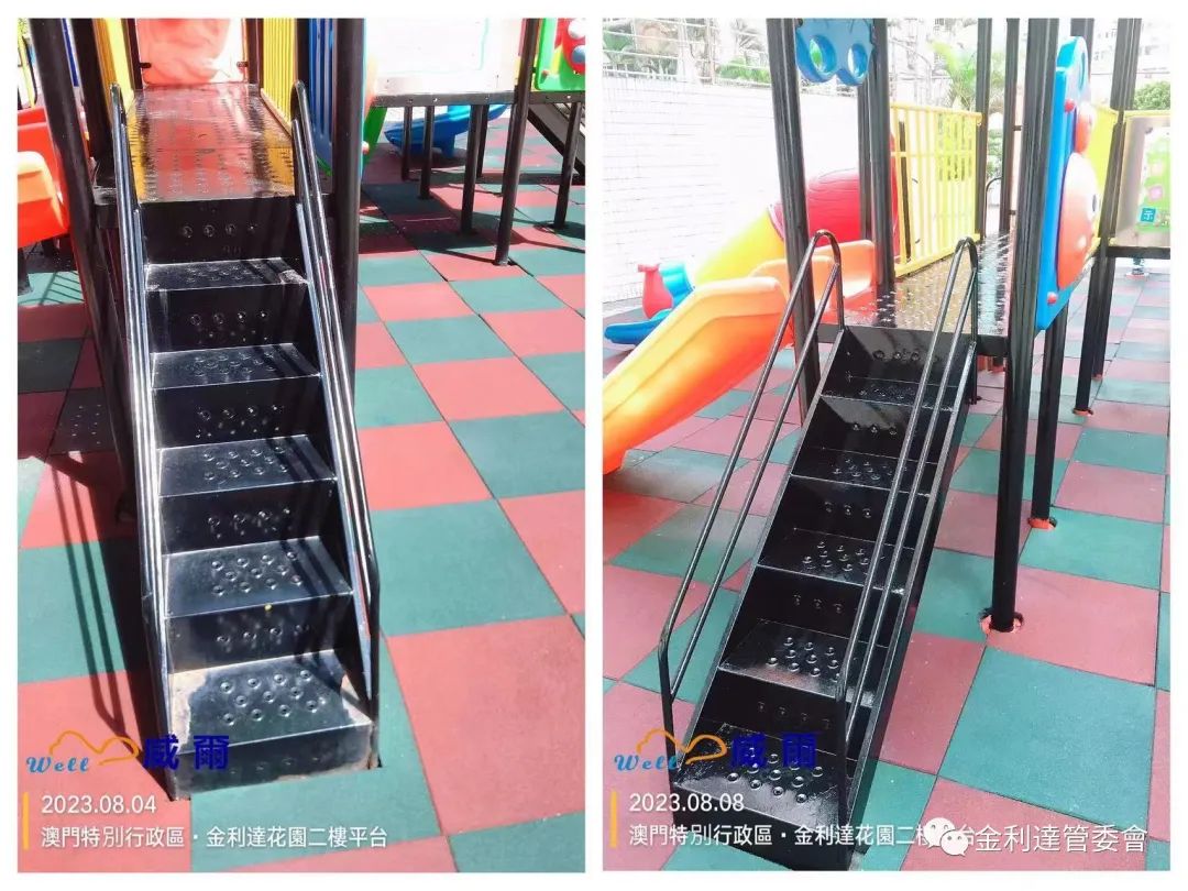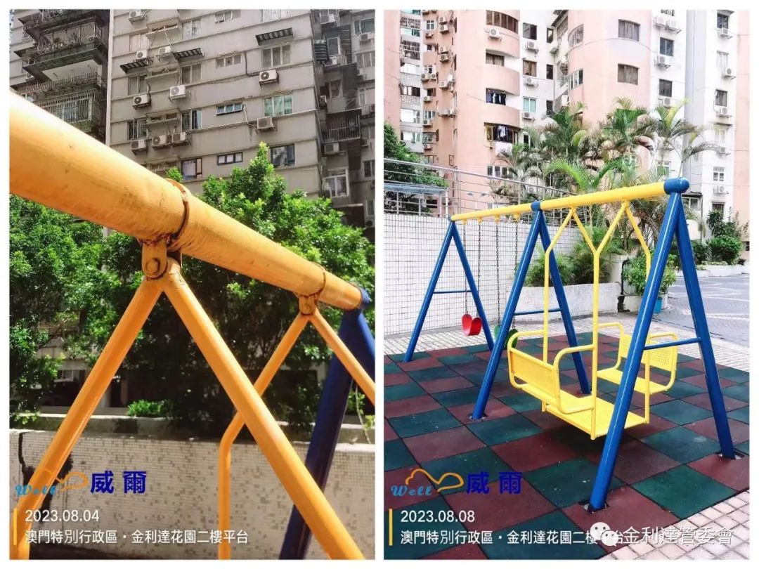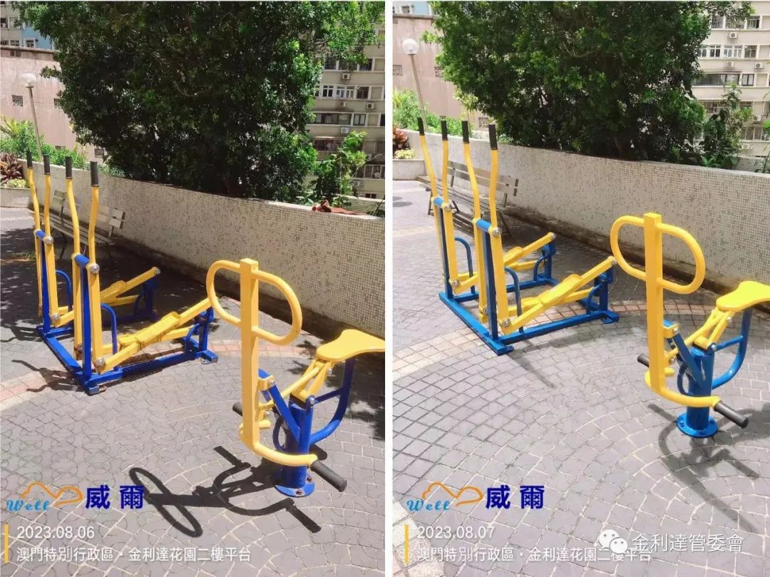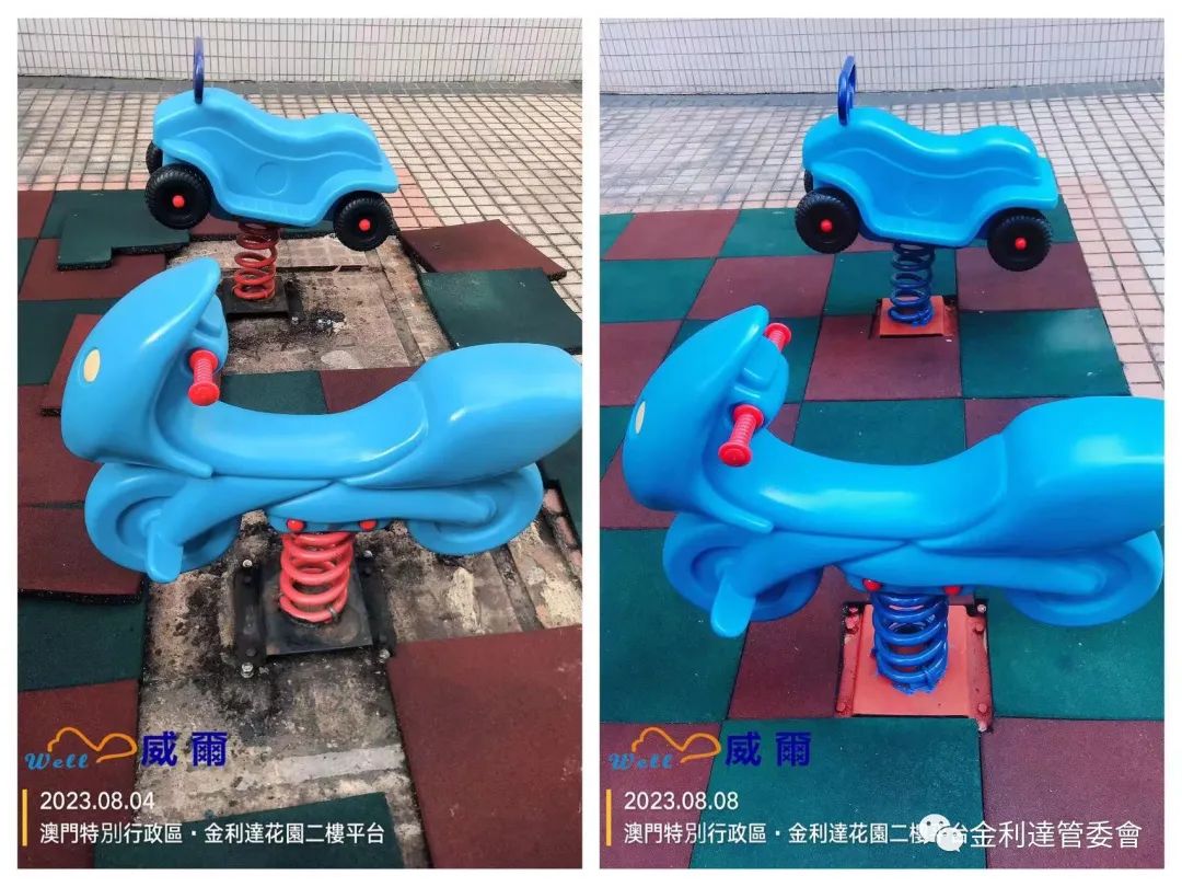 為給各業主提供一個更加多元化的休閒環境,威爾管理公司再免費為本大廈加裝了2個健身器材。同時,威爾物管派員對平台現有老化的健身設施及兒童遊樂設施進行油漆翻新工程。