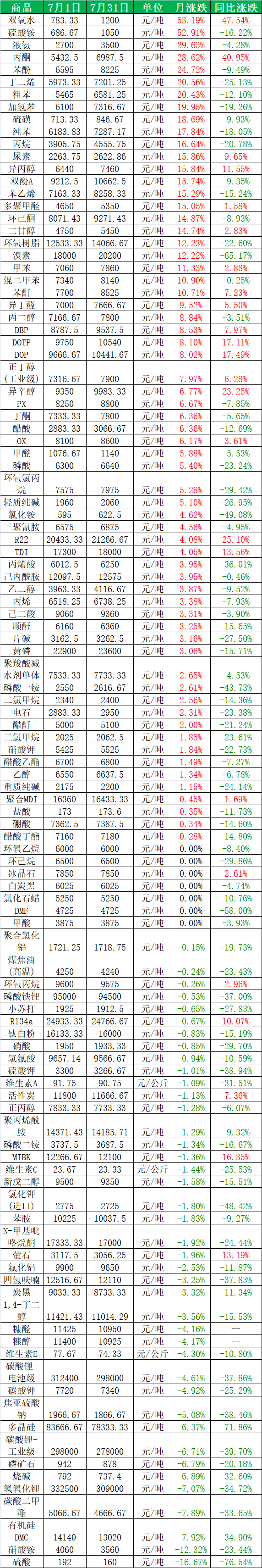 为什么会这样说呢?因为最近很多化工产品价格在经历了2个季度持续下坡路后开始支棱起来了。环氧树脂、POM很多品种涨幅都超过千元!双氧水、硫酸铵涨幅更是超过50%。短短半个月里,大宗原料价格上涨的产品多达70种,涨价产品主要分布在烃类、醇类、硝酸、无机、环氧树脂、原有下游等产业链中。
