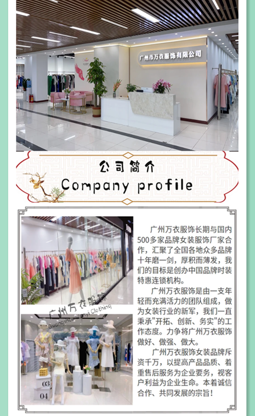广州万衣服饰女装品牌齐方式品牌扣头女装份货、专柜撤柜女装、直播见女装货源供给、实体店女装批发、线上线下女装进货渠道等多元化女装女装供给。一年下来三四百个品牌撤柜尾货供给,一个季度上百个品牌尾货供给,年龄定位:18-50岁,少淑中淑大淑、杭州货、深圳货、棉麻货都有,货源充足,风格多样,完全能满意各种类型服装生意的进货需求。万衣服饰是由一支年轻而充满活力的团队组成,做为女装行业的新军,我们一直秉承"开拓、创新、务实"的工作态度。
