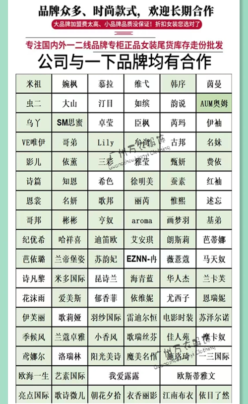 公司常年合作品牌有 纳纹 伊芙丽 秋芭莎冰麻 嘉贝逸飞 珂尼莎蔓 村上春 琦丽莎 天使之城 清静语 艾利欧 艾蜜雪 布卡慕尚 三彩 江南布衣 嘉蜜 缪斯醋酸连衣裙 莫妮卡 郁香菲 港仕迪 玛丽哥蒂冰麻 雅姿锦 拓谷 恩瑞妮 SMM 布卡拉 秋熠 羽莎国际 石头鱼 我爱巧克力 冉冉姿真丝连衣裙 香云纱连衣裙 卡琦依 淑女坊 白沙女 祝景天香 凯撒贝雷 欧莎莉格 你我约定 如缤 章那汀 纳兰世家旗袍 西子恋 真情告白 曼德诗 星期天 丽芮 迪凯 纷曼 帛兰雅 约布 慕拉 舒丽装点 木帛 唯媚 米休缇 衣全球 诗篇 木茜格 空序 卡尼欧 桑索 谜后 佐色 艾尔丽斯 衣之庄园 万古汇 张帅 迪笛欧 迪卡轩 豆谷 艺素国际 阿依莲 耶尼尔 蒂蒂猫 魔美名作 琲妮 鸢娜尔 伊捷朵 杰西伍 时尚小鱼 播 only queen醋酸 太平鸟 米祖蝶妗 三宅一生 卡贝尔 卡布奇诺 依袖 玛丽哥蒂冰麻 兰瑟 佰诗赢 赛普因 米祖 蒂言 欧时力 欧丝蒂雅文 云梦伊人 芭蒂娜 芭依璐 佐色 紫涵 海贝 紫淑 伊布都 她图 虫二 水墨生香 艾托奥 亮点国际 设计谷 遇见天 Z11 S29 朝花夕拾 黑马蓝 欧E 诗萌 水云间 巴宝莉 伊袖 片断、范思哲、菲妮迪、雅戈尔、Only、波司登、红豆、柒牌、歌莉娅、千百惠、ETAN、艾格、虫虫、太和、gucci、唐纳卡拉、PRADA、玛瑞拉、了然、艾米尔、希色、菲诺格诺、EIN·言、奥姆、玛丝菲尔、马天奴、诗篇、洛瑞林、歌力思、摩安珂、乌丫、卡汶、我爱露露、莫名、艺之卉、露密、艾米尔、云凤思儒、晒谷场、白茶、六眼飞鱼、艾米尔、赫梵茜、欧引、菲菲拉品、黄慧玲、音儿、依维妮、玛丽、维姿诺、艾唯都、歌锦、诺诗琪、三彩丽雪、依袖、珂瑮瓁琪CAGLI WASH、欧诺拉、茵美娜、木帛、吉丘古尔、艾迪潘、玖姿、迪卡轩、卡利亚里、珂瑮瓁琪、必然、艾托奥、爵馨琳、依维妮、木茜格、拓谷、卡拉贝斯、璟逸、西蔻、牧迪、慕涛夏、卡布拉、卡嘉茜、尤西子、贝茜妮、卡拉佛、欧柏兰奴、欧尼迩、珂尼蒂思、娜尔思、卡迪黛尔、艾奴伊、珂莱蒂尔、曼娅奴、希色、纽芳、阿丹娜、思慕缇、米可芭娜、欧尼迩、麦中林、拉蒂、琪奥斯、奕色、哥芙妮、卡拉贝斯、艾米拉、维多利亚、郎文斯汀、米拉格、衣香丽影、欧蒂芙、小渔仔、莫妮卡、卡嘉茜、艾梅尼特、法尔莎、洛炫、凯撒贝蕾、茵曼、诗凡黎、朗戴国际、迪卡轩、DJFF、米柯拉、粉黛丽人、茵佳妮、唯简尚、浅秋、痕迹、阳光里的汀兰、雅莹 品高pinko、爱客、言茶、西树影黛、拉夏贝尔、华丹妮、 Misslace、玛丽歌蒂、慕拉、亨奴、尊贵夫人、艾丽尔斯A.E.NICE、欧丝蒂雅文、遇见天、玛塞莉、墨曲、欧时力、太平鸟、宝贝玛丽、奥柔拉、周仕依林、一琢、纪优希GUC、加末Jamor、飘蕾、谷邦GOOBGS、简约风情、伊芙丽、真情告白、芙纯、衣例、昆诗兰、班晓雪、江南布衣、秋熠、地素、嘉贝逸飞、亮点国际、衣全球、哥弟、魔美名作、一目了然、设计谷、注释、菲拉普高登、佧茜文、芭莉、春上村、朗扣、欧时力FivePlus、朴画、唯伊、无涩一诺、艾安琪、特儿迪雅、伊纳芙、露蜜、芭依璐、迪笛欧、欧E黑马蓝、新作、梦妮莎、马克华菲、CHICHY、哈祥喜、莫西摩、艾利欧、芭丽景娅尼蒂斯、韩序、秋水伊人、曼德诗、三宅一生、韩宜、纳纹、虫二、MO、石库门、佰莉衣橱、你即永恒、芝麻E柜、素帛、OTT、曼妮芬、白领、布根香、春美多、乔帛、朵以、卡蔓、纽方、容悦、迪如、底色、夺宝奇兵、千百惠、意澳、朝花夕拾、简约风情、佐色、城市衣柜、雪歌、艺梦来、例格、茵曼、唯弋、百图、赫梵茜、纷漫、衣香丽影、江南布衣、香影、秋水伊人、爱诗帛雅、艾丽哲、伊纳芙、雅意娜菲、曼娅奴、丹比奴、生活美学、佧茜文、秋熠、邻家女孩、水墨生香、谷度、阿莱贝琳、颜上、季候风、傲丝度、纳帕佳、春美多、布根香、迪如、底色、卡蔓、秋熠、容悦、乔帛、佐色、城市衣柜、谜底、夺宝奇兵、简约风情、蓝色倾情、茵曼、唯弋、雪歌、雅意娜菲、瑞贝尔、赫梵茜、例格、、纷漫、必然、衣魅人、香影、、爱诗帛雅、红凯贝尔、百图、印象草原、迪图、娅丽达、37°生活美学、石库门、例格、红凯贝尔、百图、谷可、殿秀、搭姿、KAKO上、丹缇施、爱城市、雪歌、春美多、、布根香、唯弋、夺宝奇兵、淑女屋、华丹尼、迪如、衣香丽影、浅秋、朵以、逸阳、底色、容悦、百家好、曼娅奴、必然、乔帛、阿桑娜、纽方、秸熙、雅意娜菲、古今、谜底、REVIVO 简称UR、秋熠、迪图、钡萱、十月妈咪、钡禾、卡蔓、浪漫一身、艺梦来、帕兰朵、名师路、朝花夕拾、衣之吻、娅尼蒂斯,INC,陌心