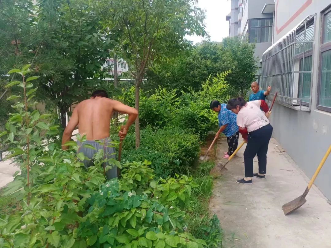 毓秀社区物业工作人员对绿化带杂物进行清理,营造良好的社区环境。