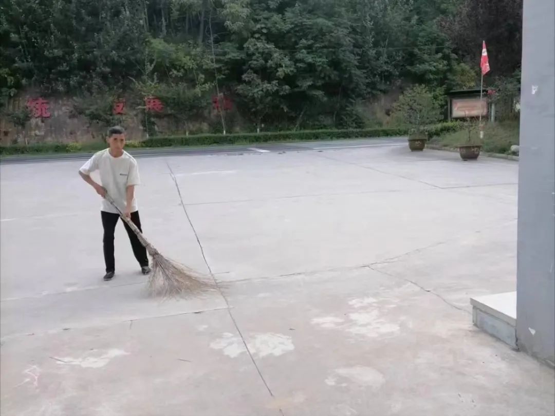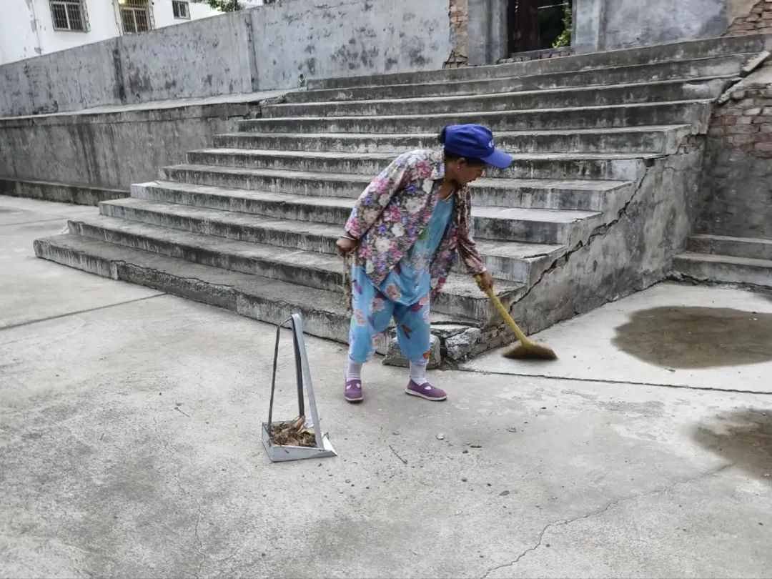 西川社区物业工作人员打扫社区公共区域的卫生,营造良好的社区环境。