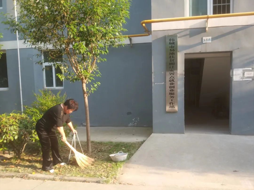 城市嘉园小区物业工作人员打扫小区公共区域的卫生,营造良好的小区环境。